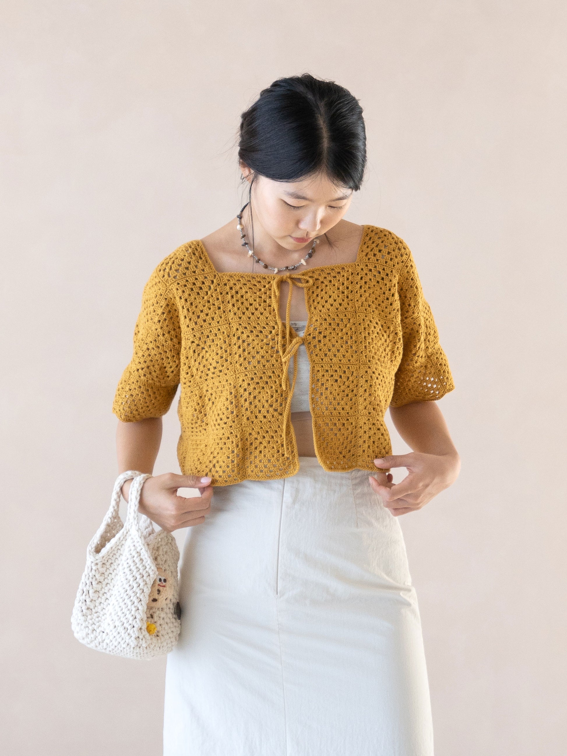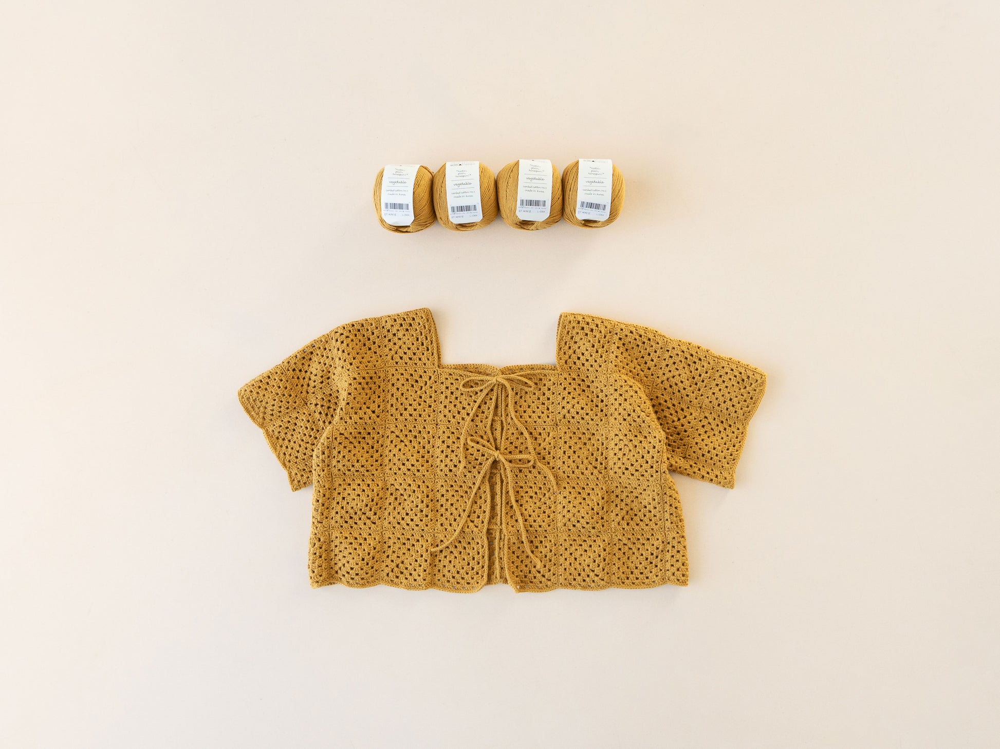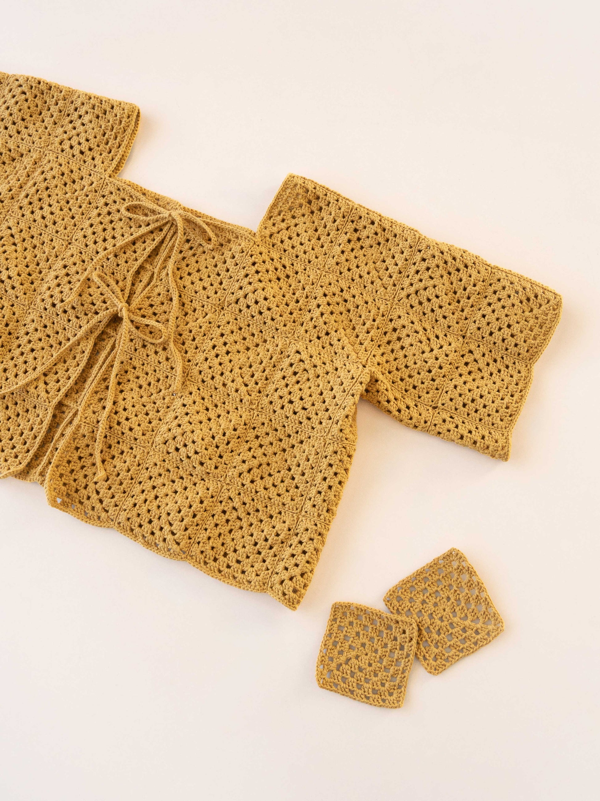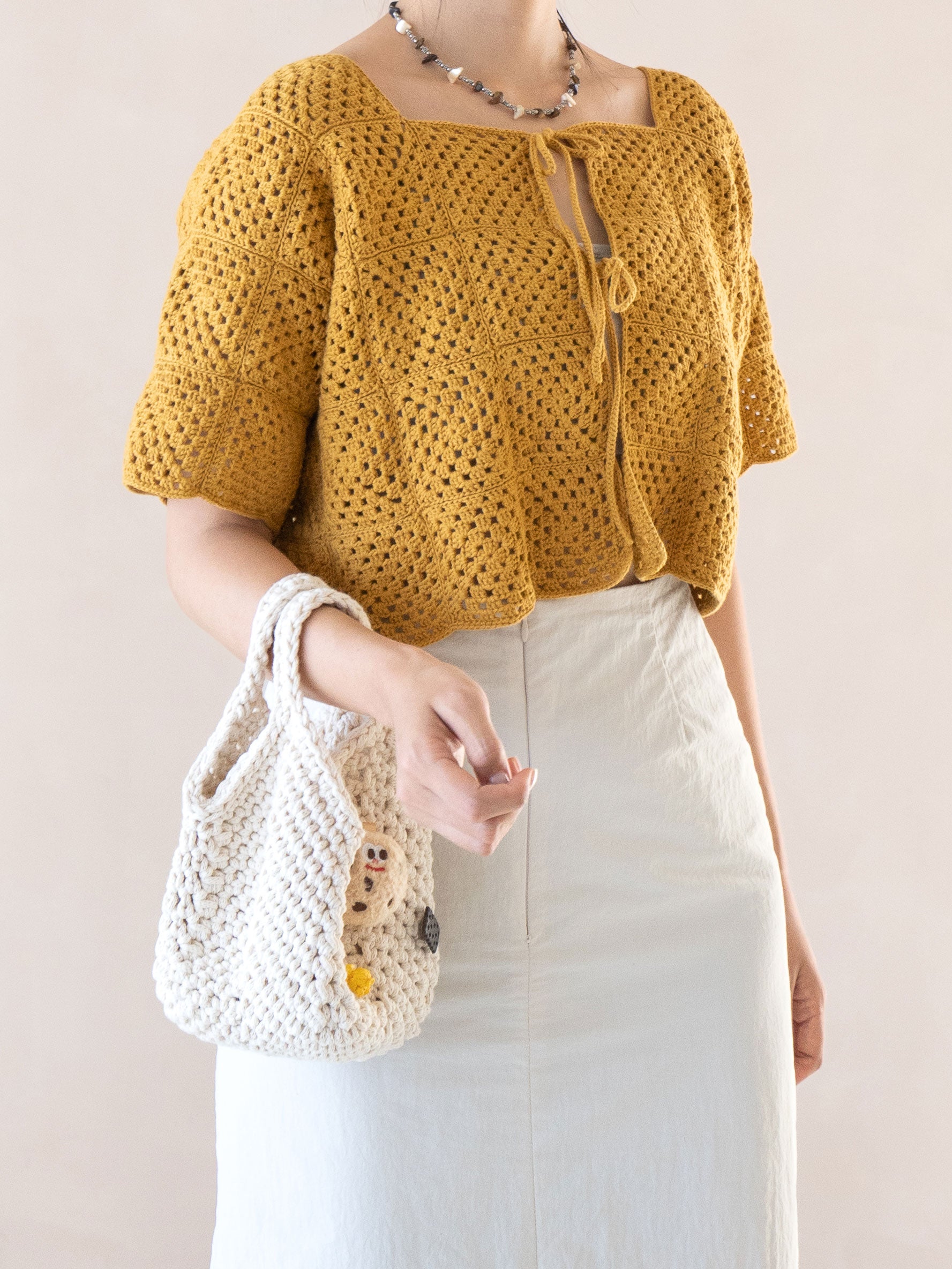 사각형 모티브를 조각조각 연결해 만드는 코바늘 가디건입니다. 고슬고슬하고 먼지 없는 베지터블로 떠서 세탁 및 관리가 편합니다. 여름에는 단독으로 시원하게 입기 좋고, 간절기에는 긴팔 이너를 매치해서 입으실 수 있습니다. 가슴 둘레를 여유있게 입어야 불편하지 않은 디자인이기 때문에 15-20cm 정도 여유를 두고 사이즈를 선택해주세요. 전체 동영상 강의가 제공되며 모티브 크기로 사이즈를 조절할 수 있고, 앞섶을 여미는 리본도 원하는 위치에 달아줄 수 있습니다. 작품 난이도는 쉬운 편이지만 완성까지 시간이 오래 소요될 수 있습니다.