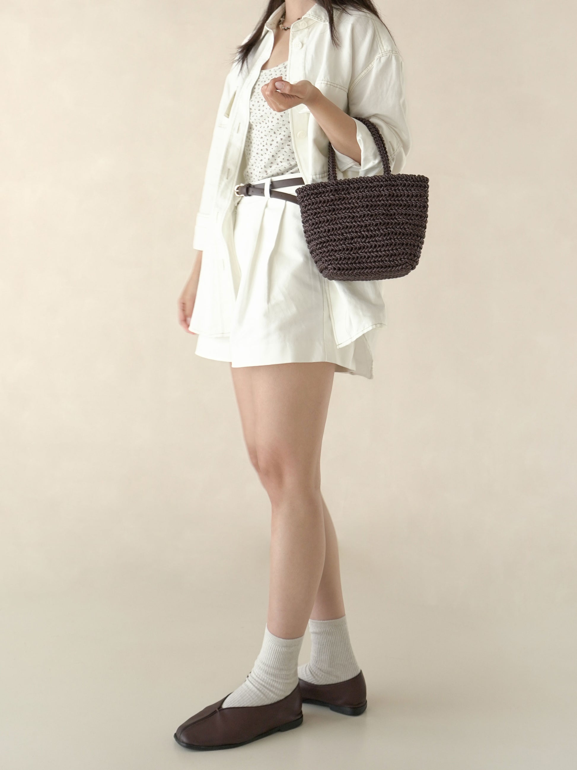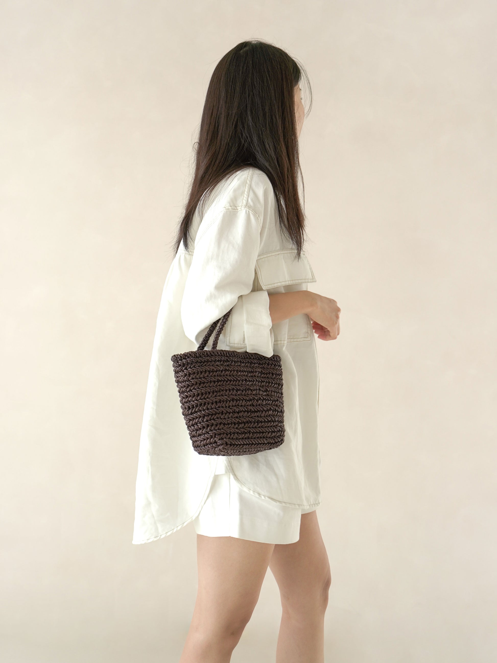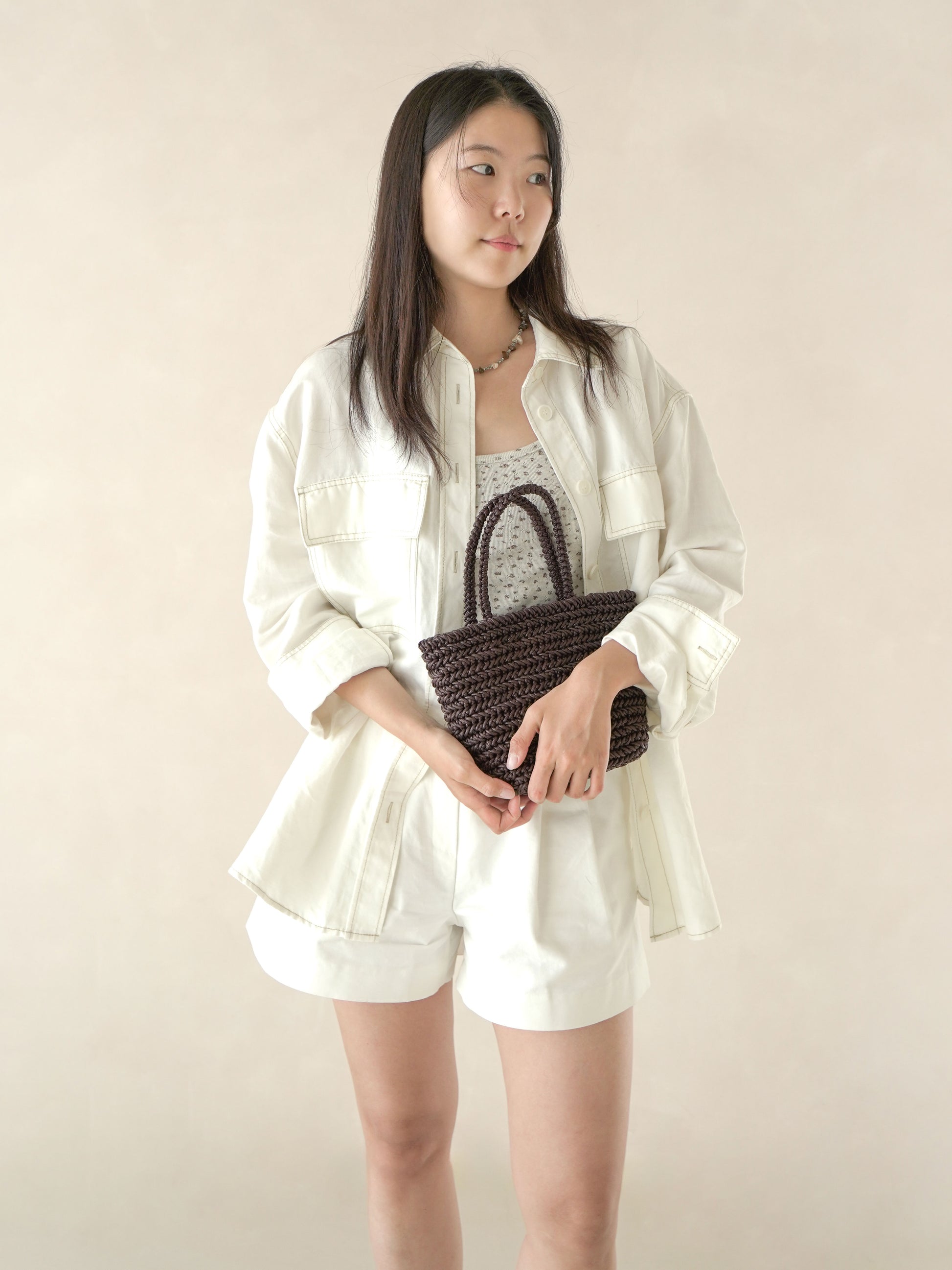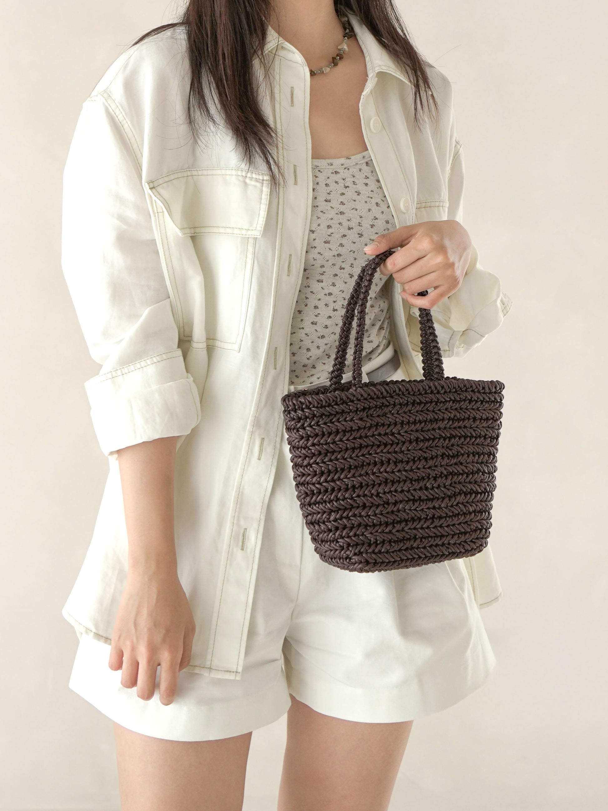 헤링본 스티치를 활용한 미니백입니다. 가방 몸통에서 늘림을 주어 위로 갈수록 살짝 퍼지는 디자인으로 미니백이지만 수납력이 좋습니다. 가방 마무리에서는 진행방향을 바꾸지 않으면서 되돌아 짧은뜨기와 비슷한 느낌을 낼 수 있는 방법을 영상을 통해 쉽게 배우실 수 있습니다.