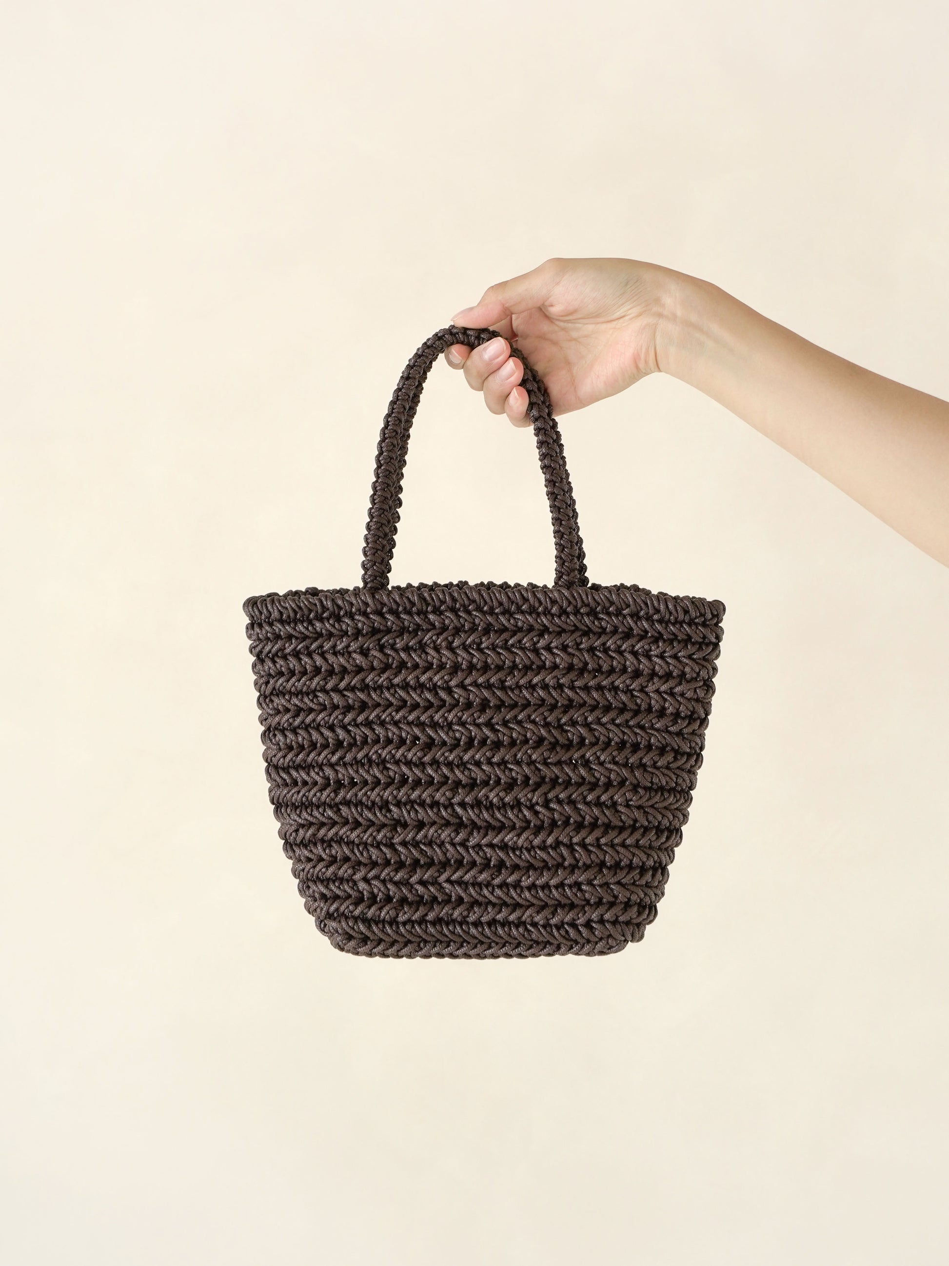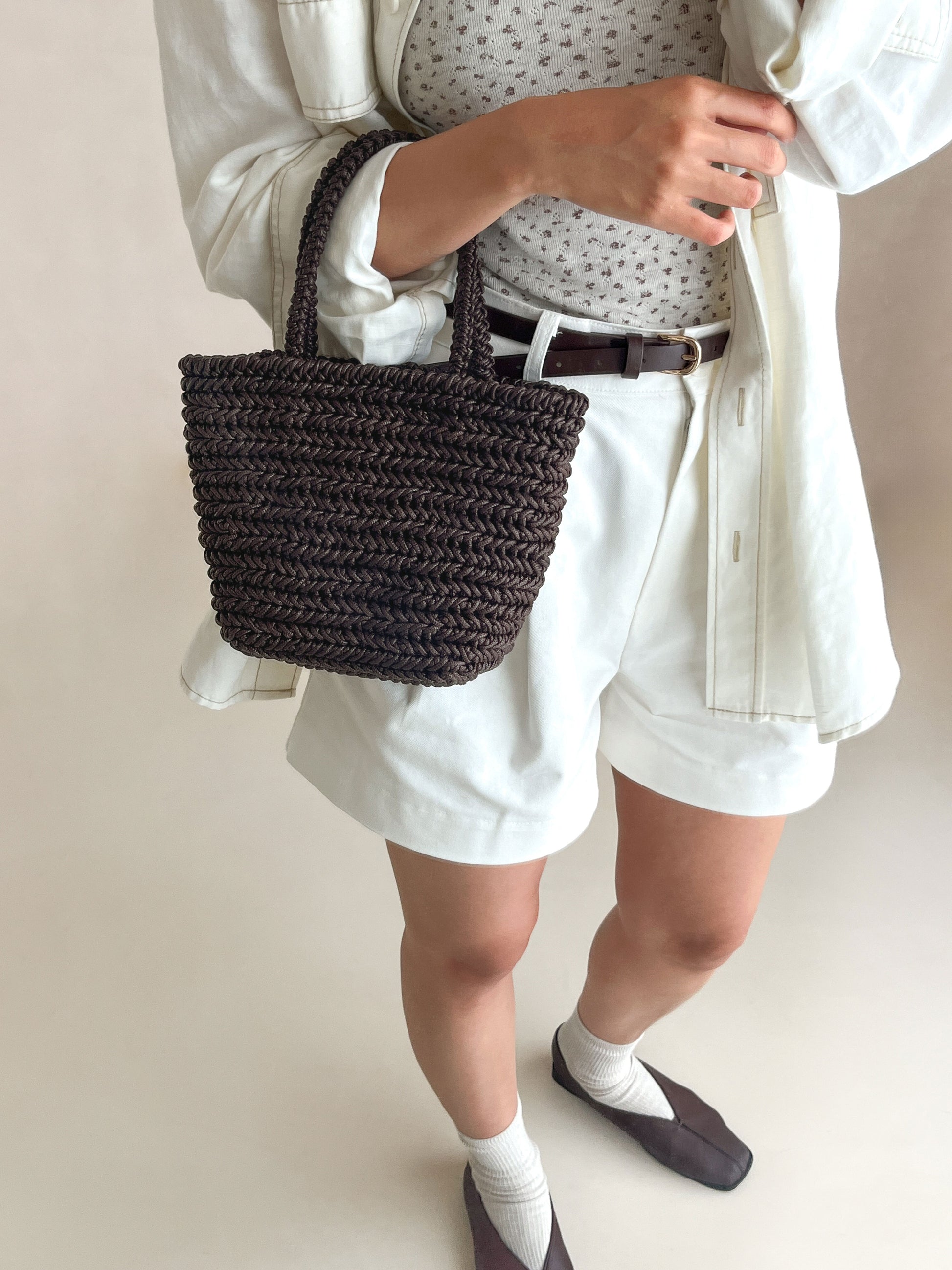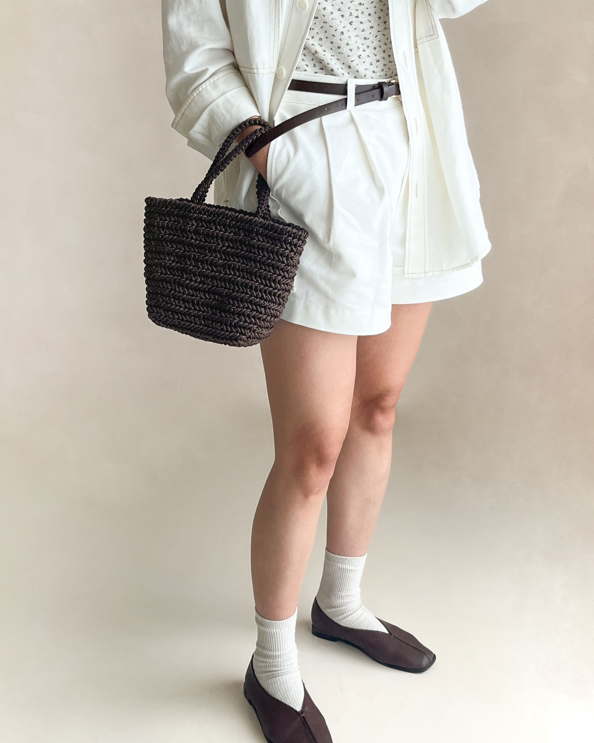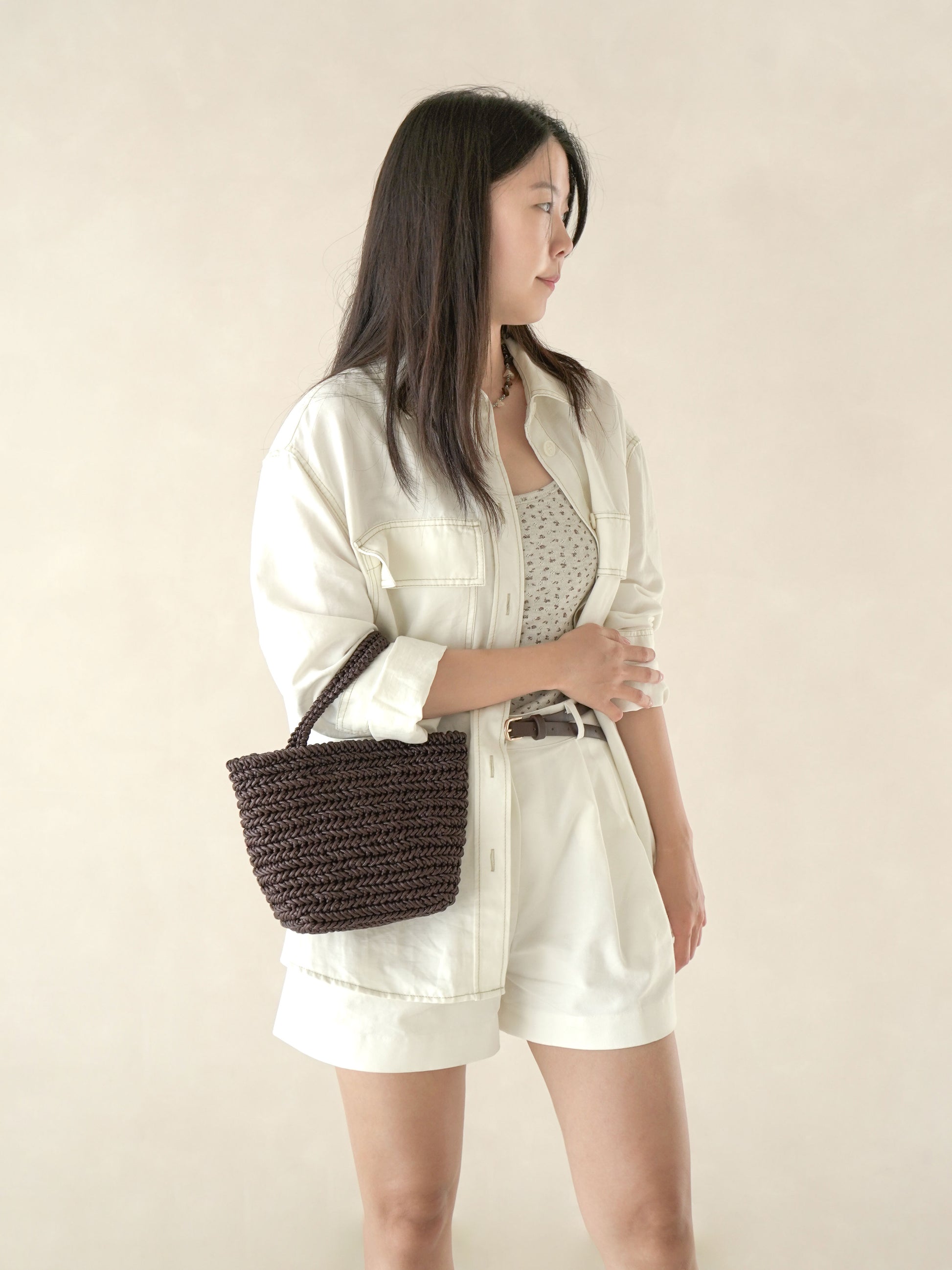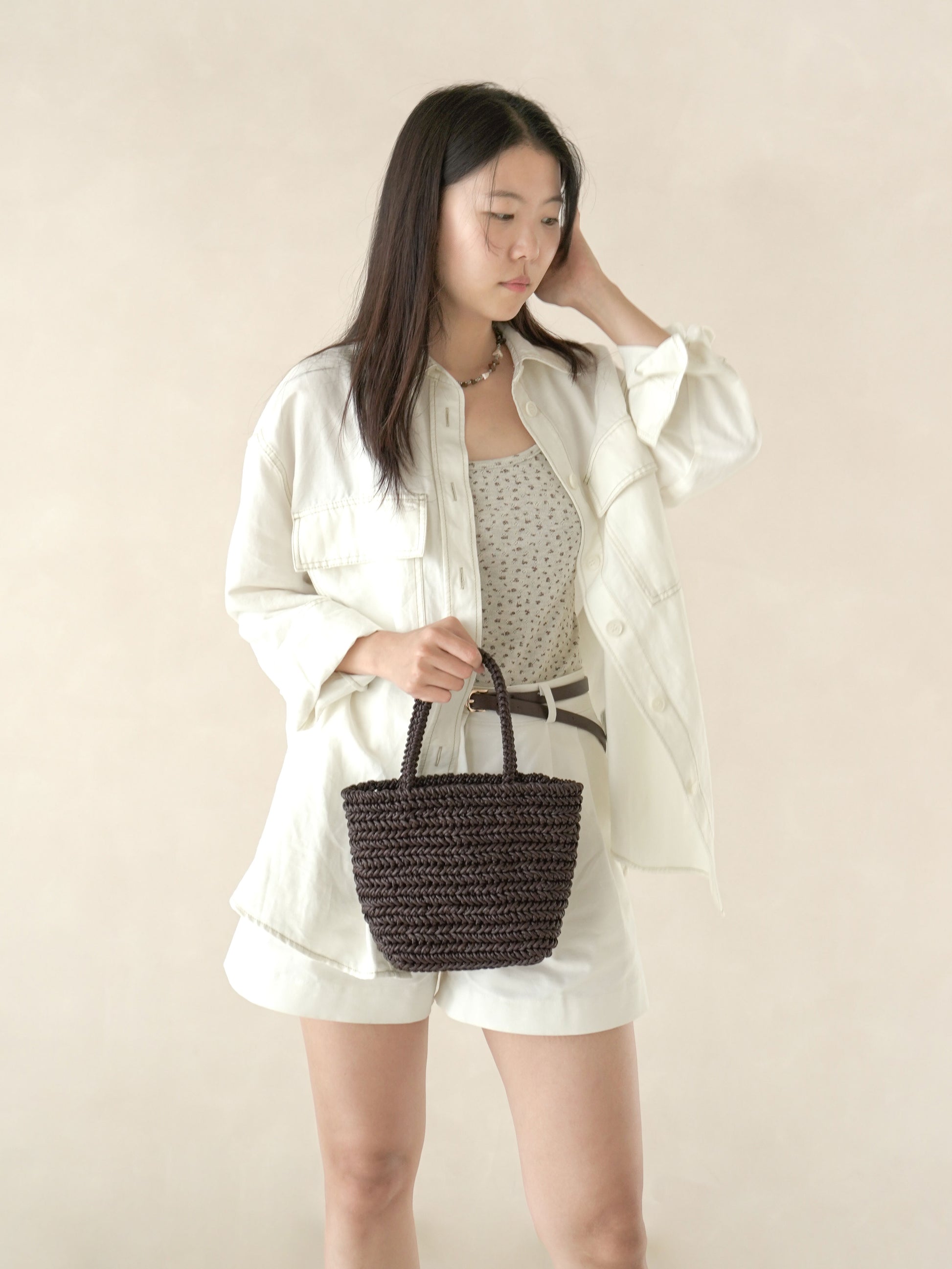 헤링본 스티치를 활용한 미니백입니다. 가방 몸통에서 늘림을 주어 위로 갈수록 살짝 퍼지는 디자인으로 미니백이지만 수납력이 좋습니다. 가방 마무리에서는 진행방향을 바꾸지 않으면서 되돌아 짧은뜨기와 비슷한 느낌을 낼 수 있는 방법을 영상을 통해 쉽게 배우실 수 있습니다.