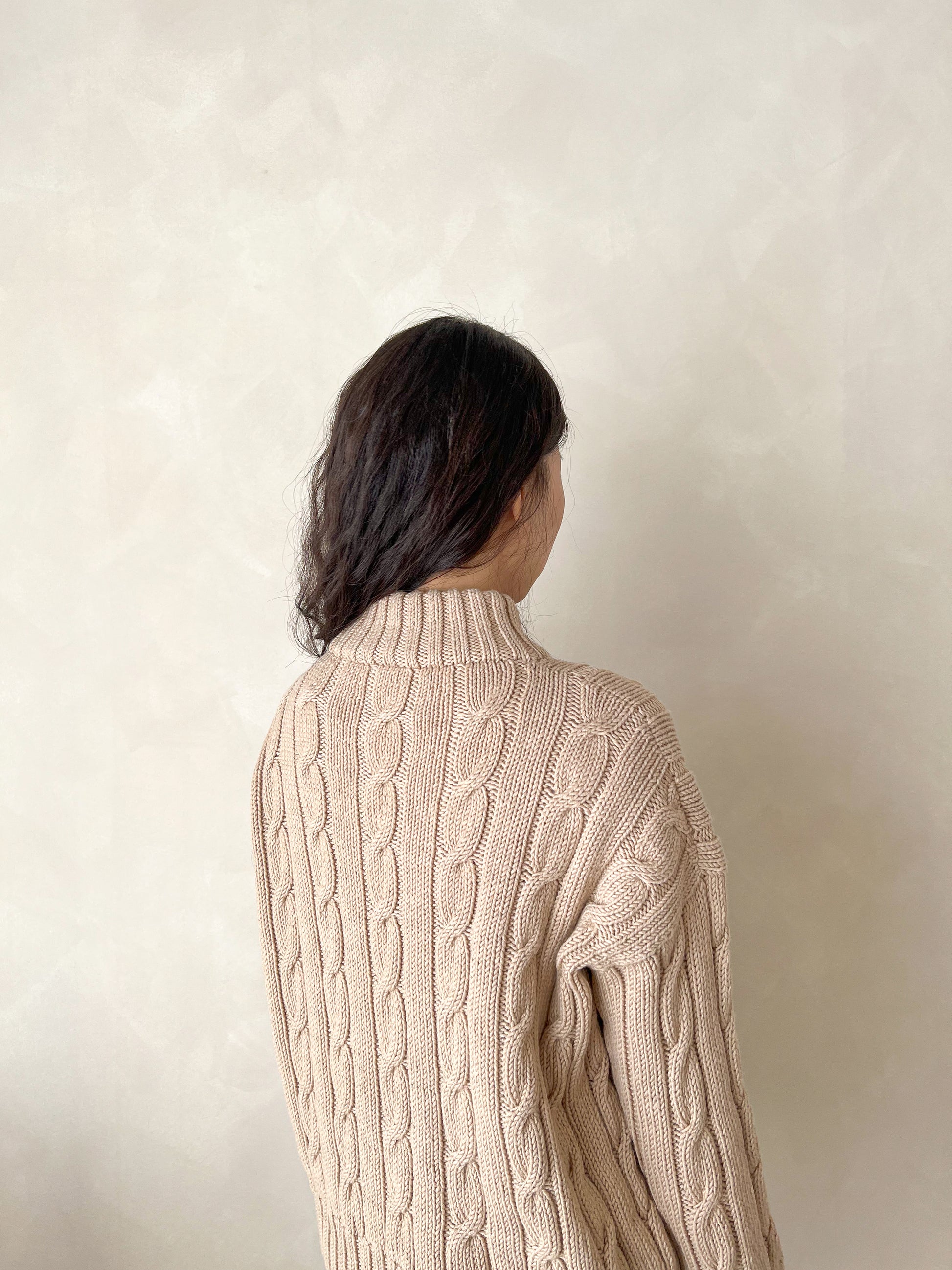 탑다운 방식으로 뜨는 심플한 꽈배기 하프집업 스웨터입니다. 뒷판 상단에 어깨처짐을 주어 떠준 다음 앞판을 각각 따로 떠서 지퍼를 꿰매줄 부분을 만들어주고, 뒷판과 연결하여 몸통을 원통으로 떠줍니다. 소매는 코를 주워 원통뜨기로 작업하며, 목 카라부분에서 코를 주워 길게 뜬 후 반을 접어 안쪽에서 연결하여 마무리합니다. 넉넉한 오버사이즈 핏으로, XL사이즈의 경우에는 남성 100-105 사이즈를 입으시는 분들께 딱 맞는 사이즈입니다. 상세한 도안과 지퍼 달기 동영상이 제공됩니다.