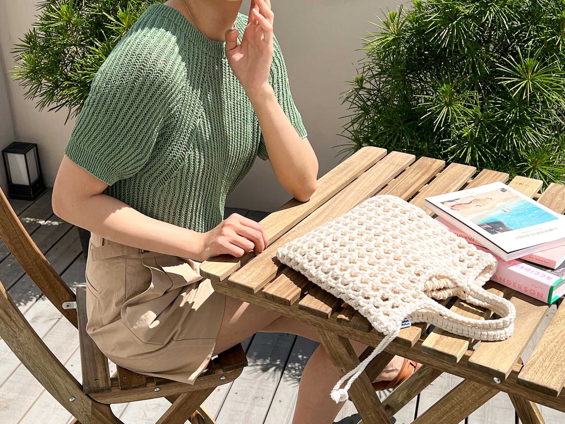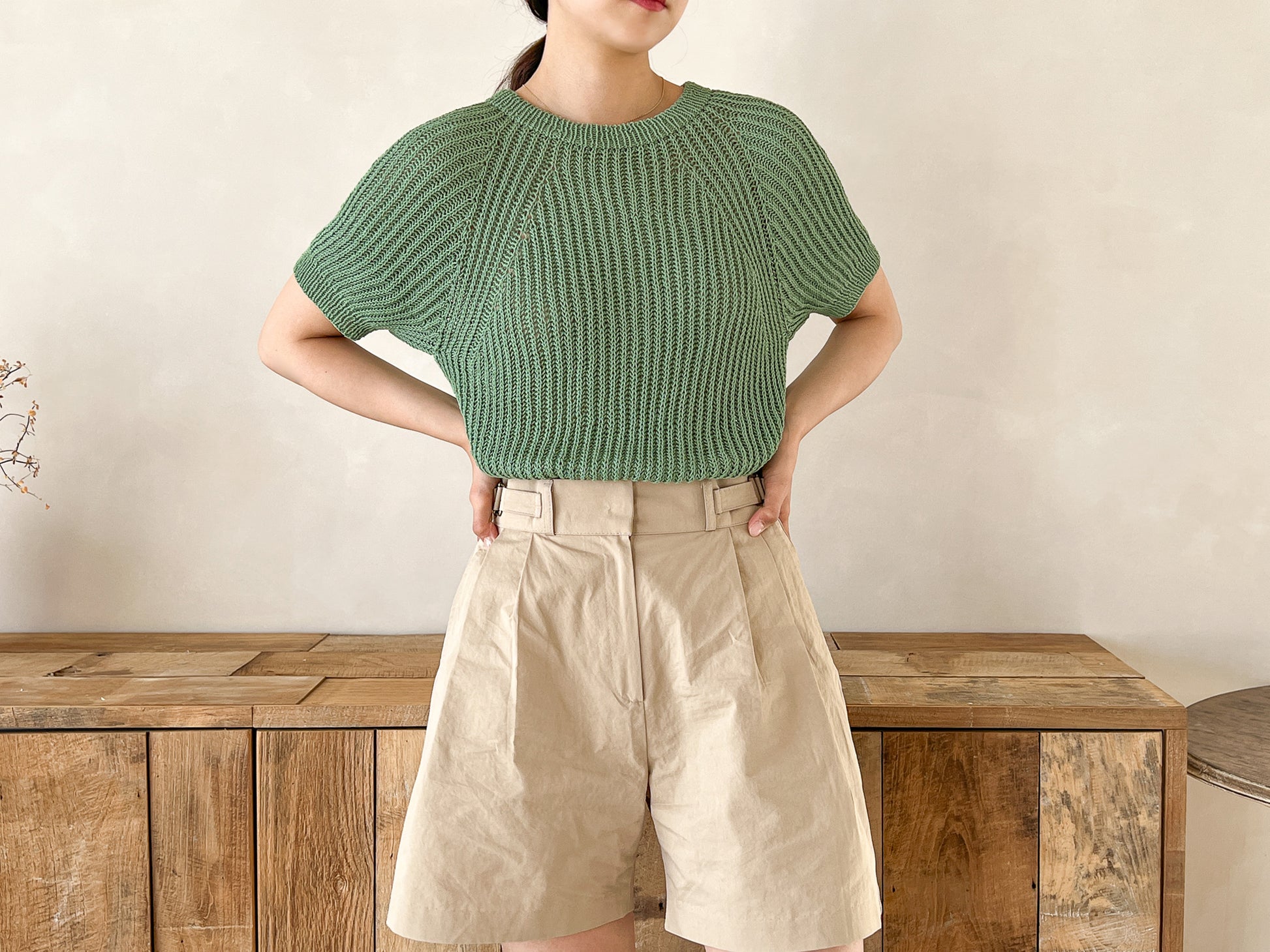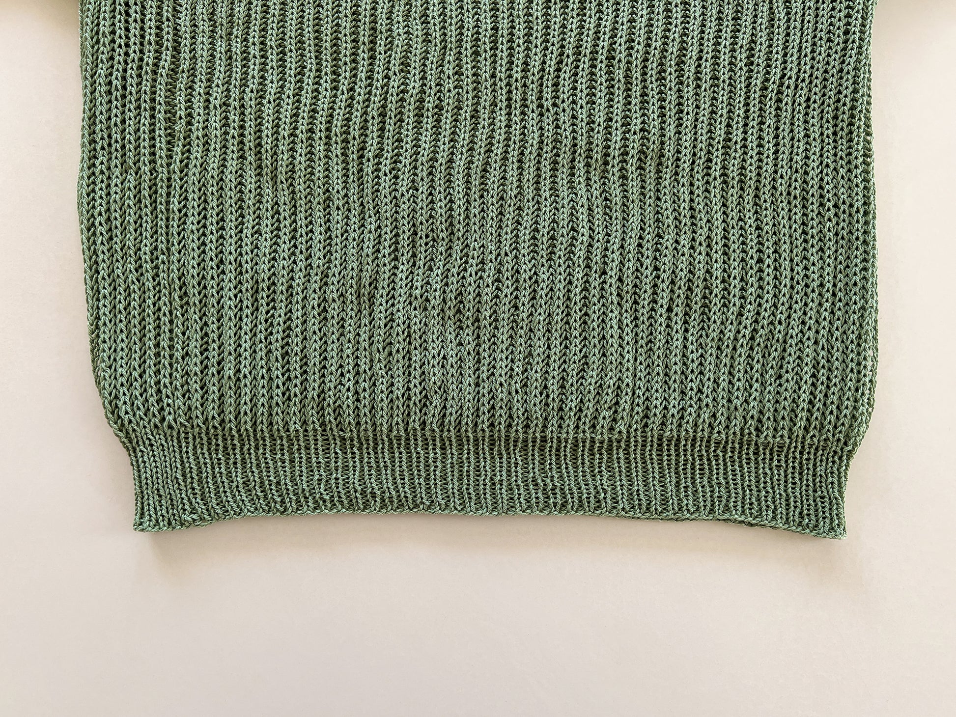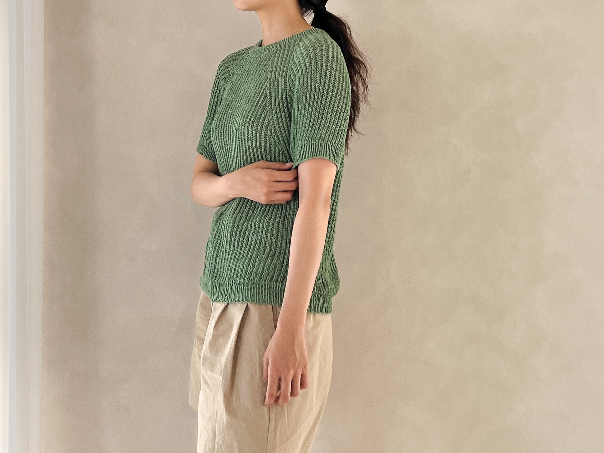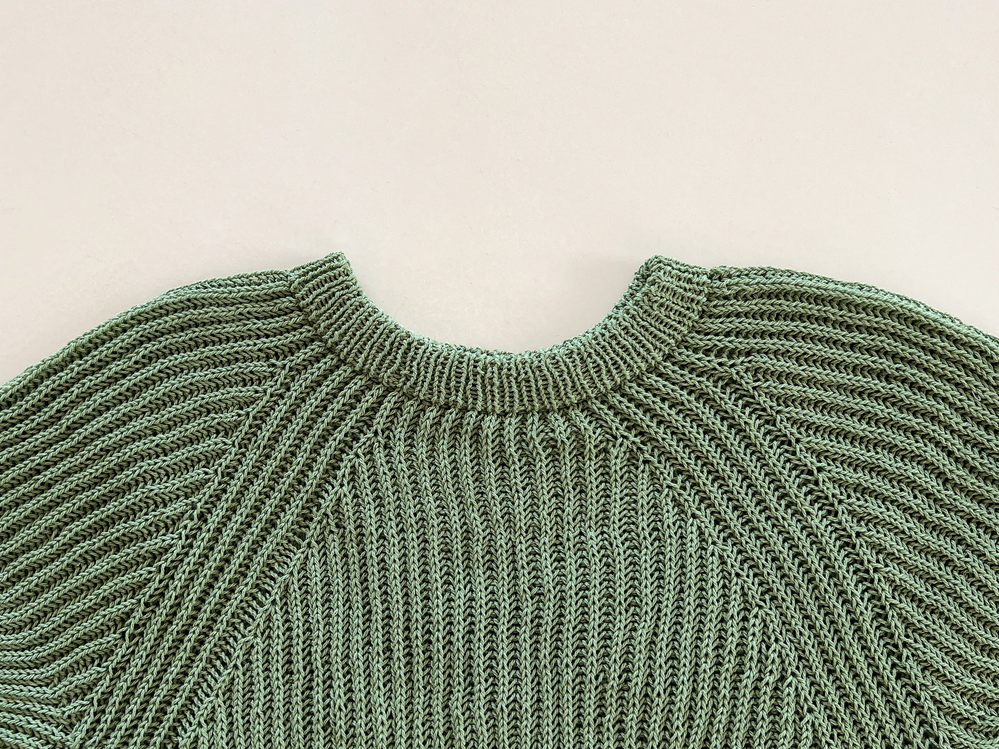 The neckline is finished with a folded double-layer band for a refined look. Since it’s worked top-down starting from the neck ribbing, there’s no need to pick up stitches, making the process smooth and convenient.