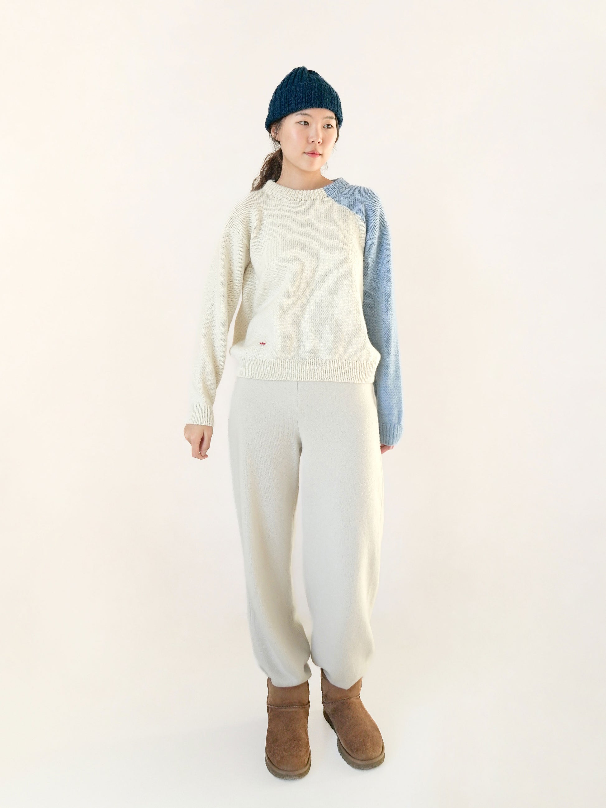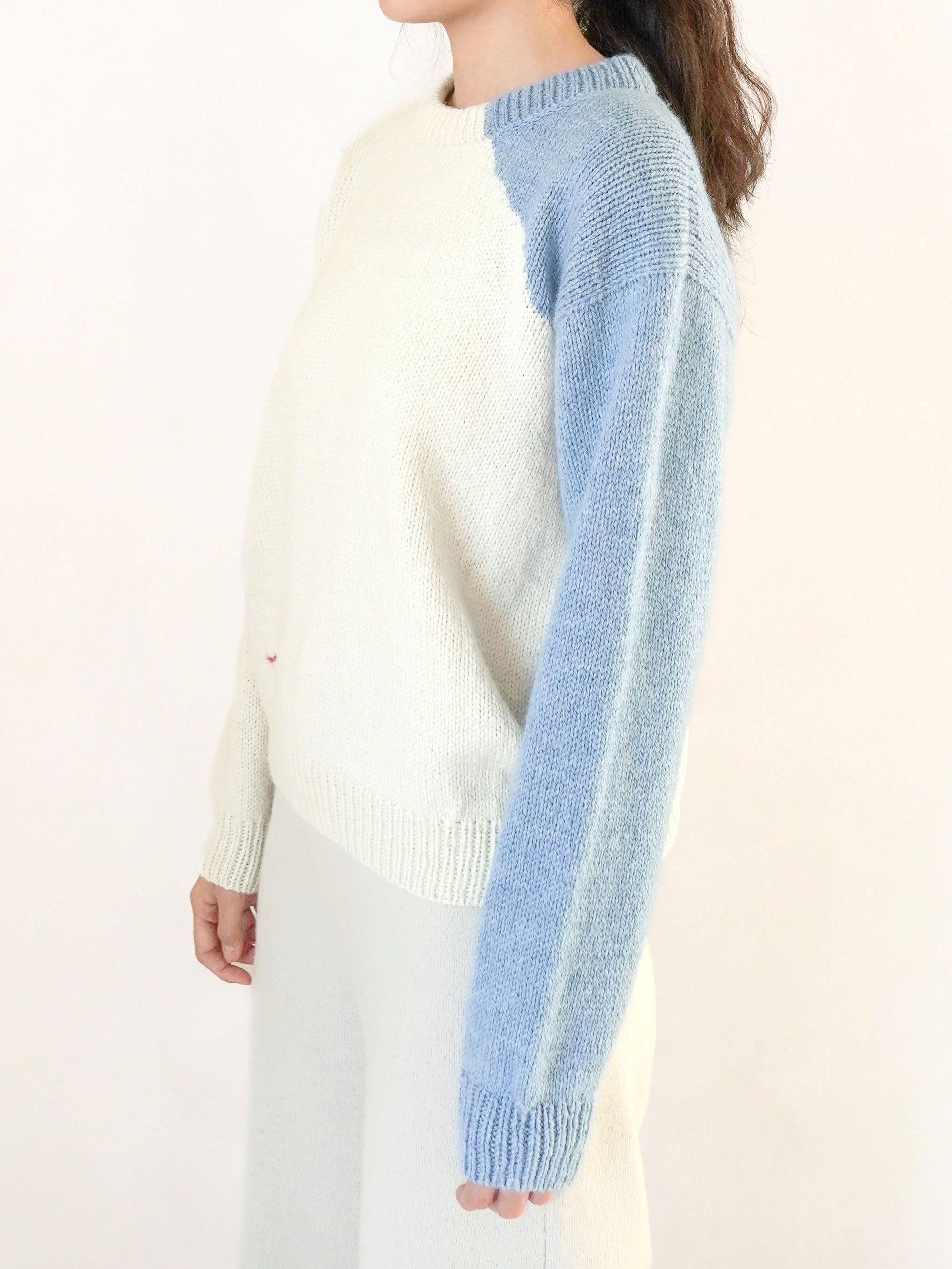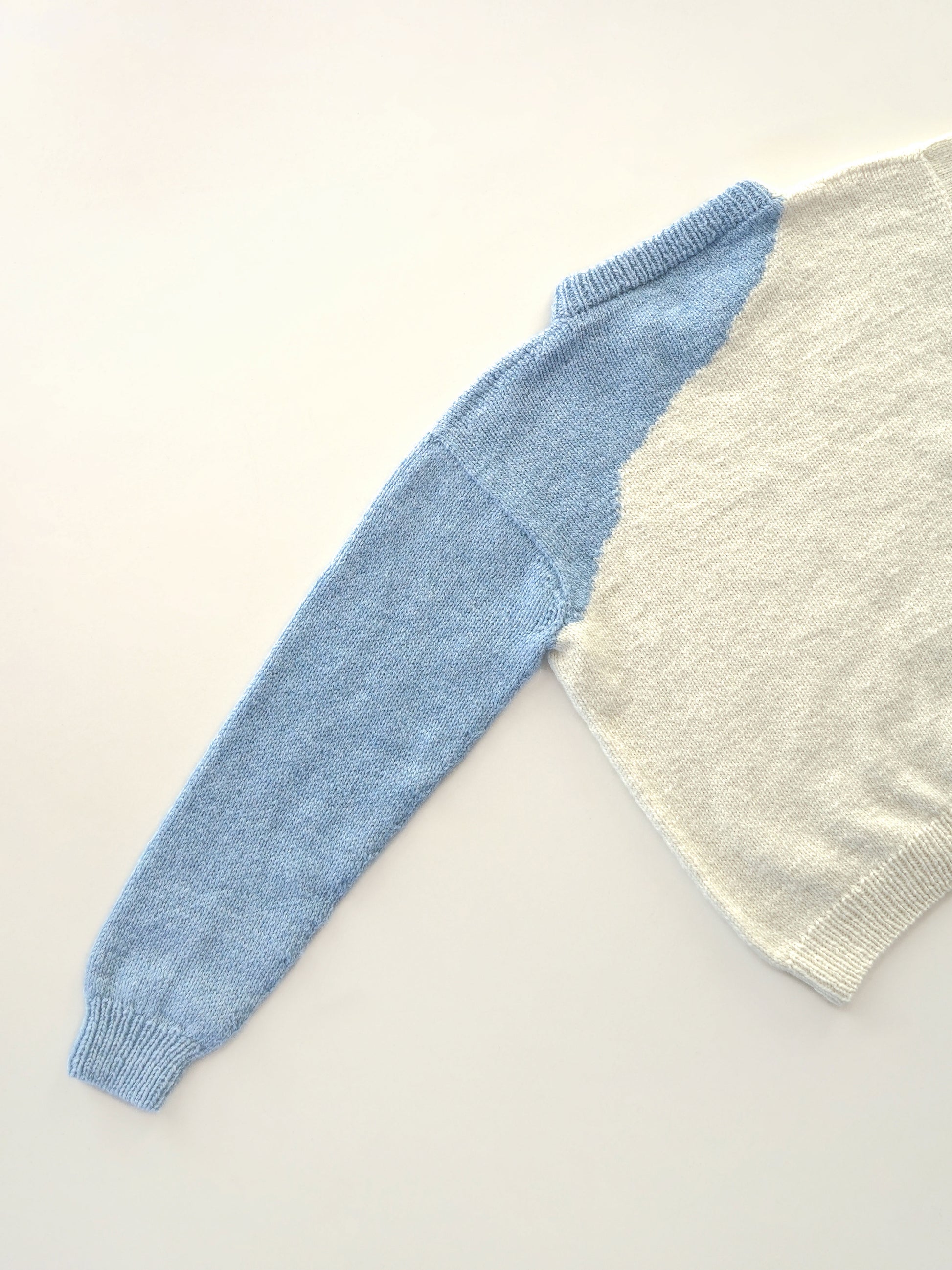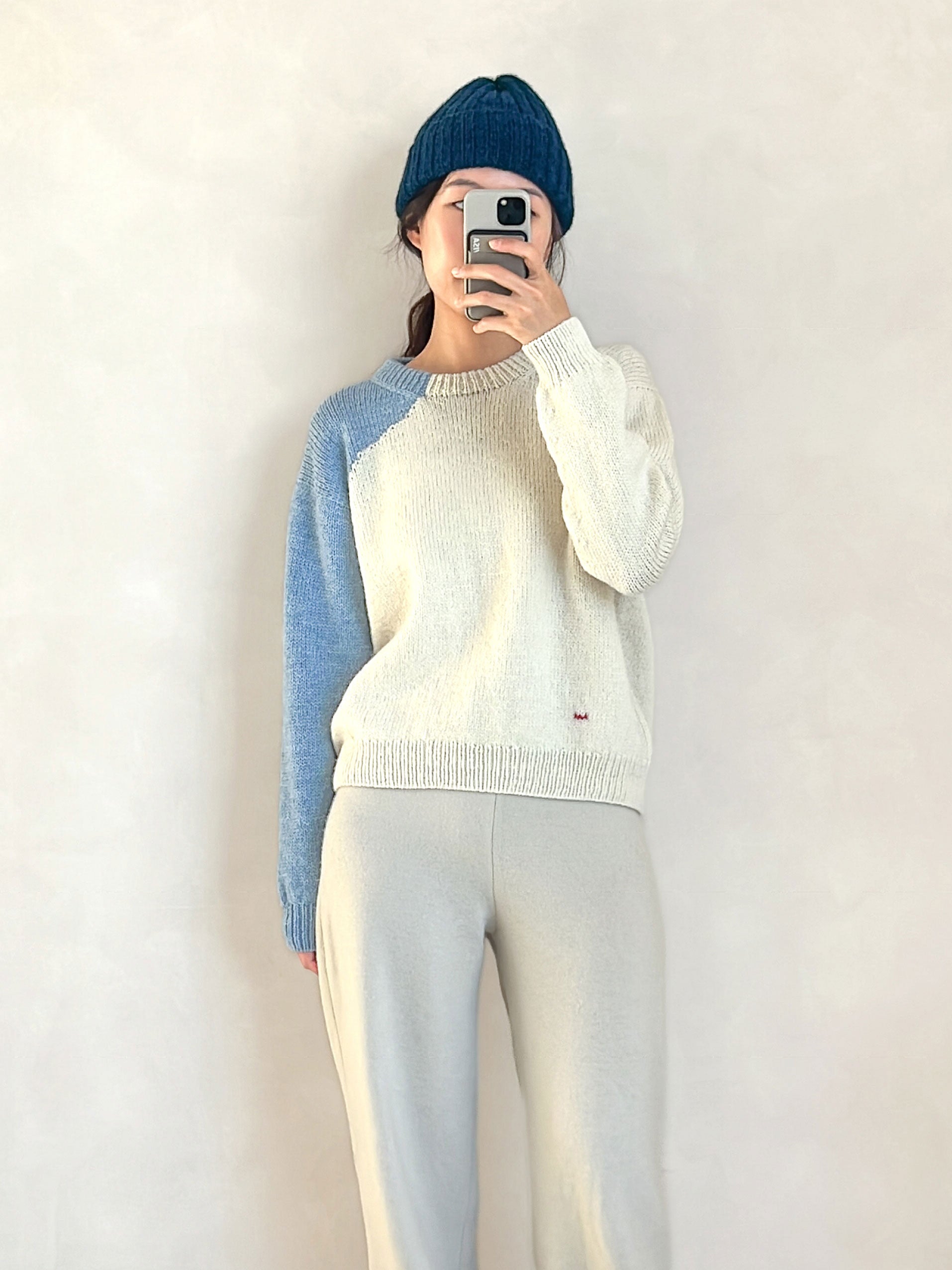 This colorwork sweater is inspired by the glaciers of Iceland. Using the intarsia technique, the color changes are worked over small sections, allowing you to enjoy colorwork in a simpler and more yarn-efficient way than Fair Isle knitting.
