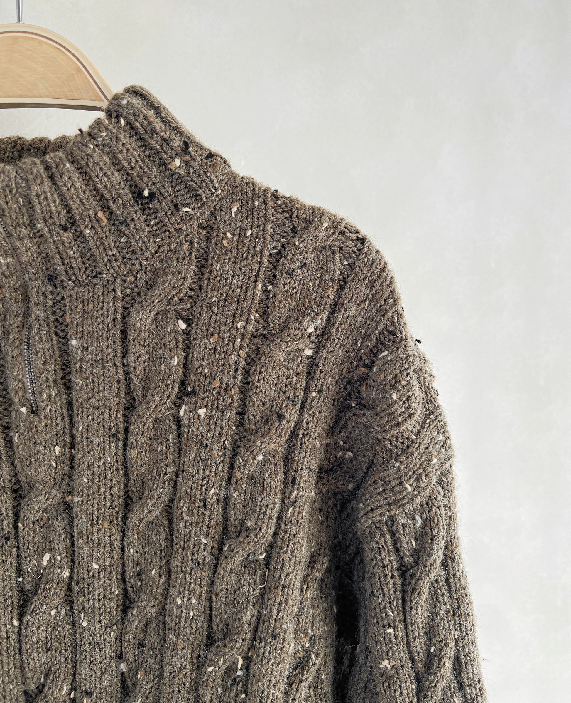 This is a simple cable half-zip sweater worked top-down. The back begins with slight shoulder shaping, then the front is knitted in two separate pieces to form the zipper opening. After that, the front and back are joined and the body is worked in the round. The sleeves are picked up and knitted in the round, and the neck collar is worked by picking up stitches, knitting it long, folding it in half, and sewing it down on the inside. The fit is a relaxed oversize; for reference, the XL size fits men’s 100–105 KR size well. A detailed written pattern and zipper-installation video tutorial are included.