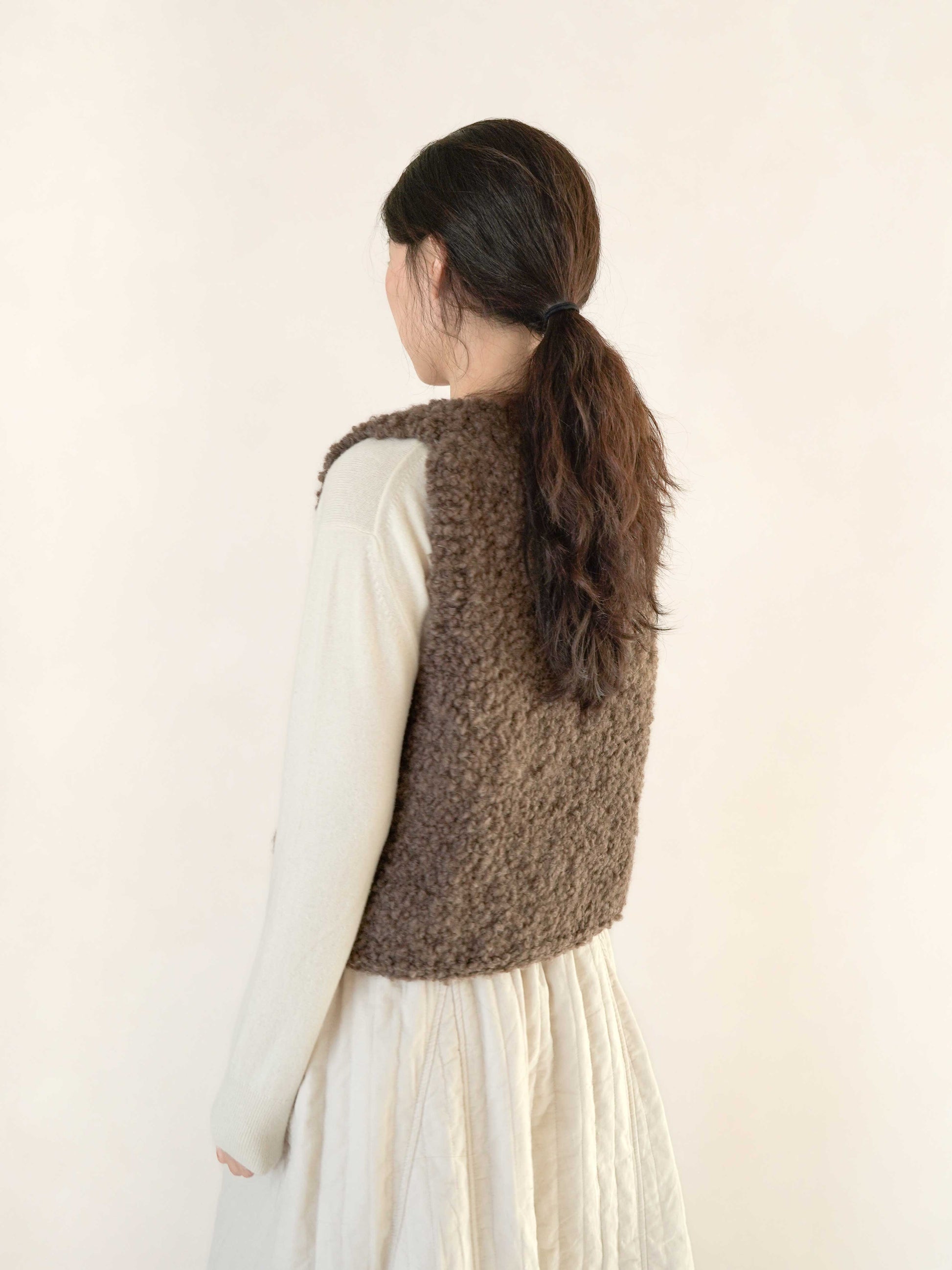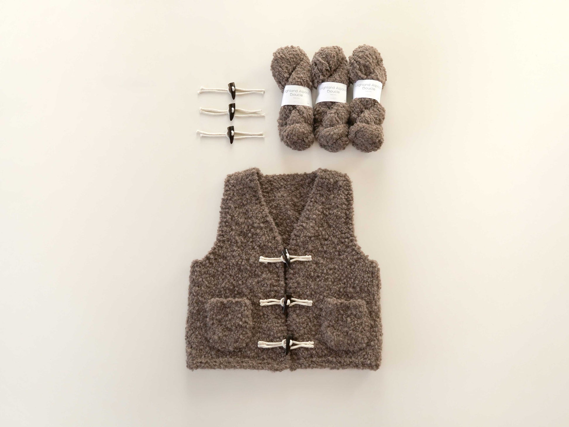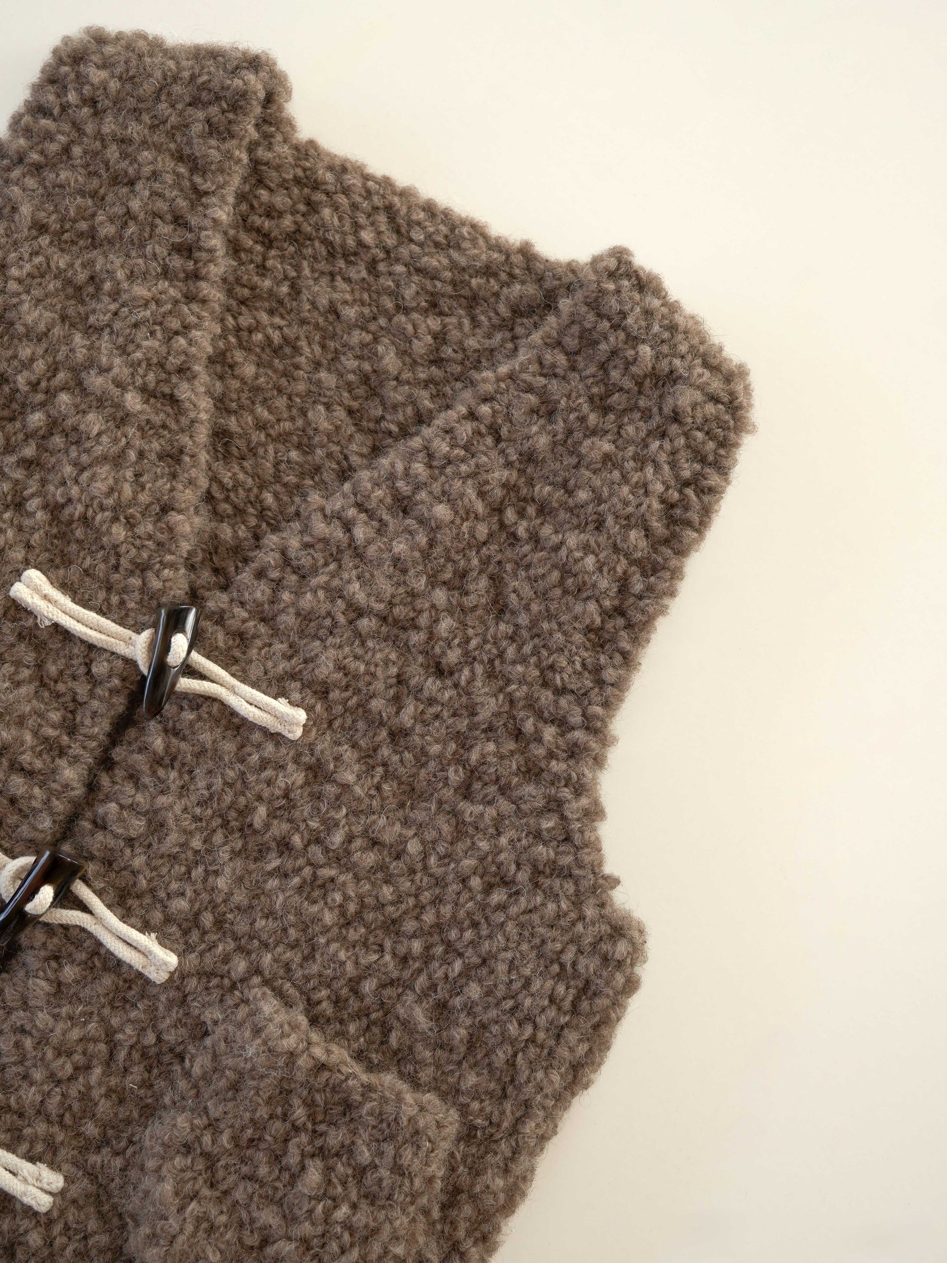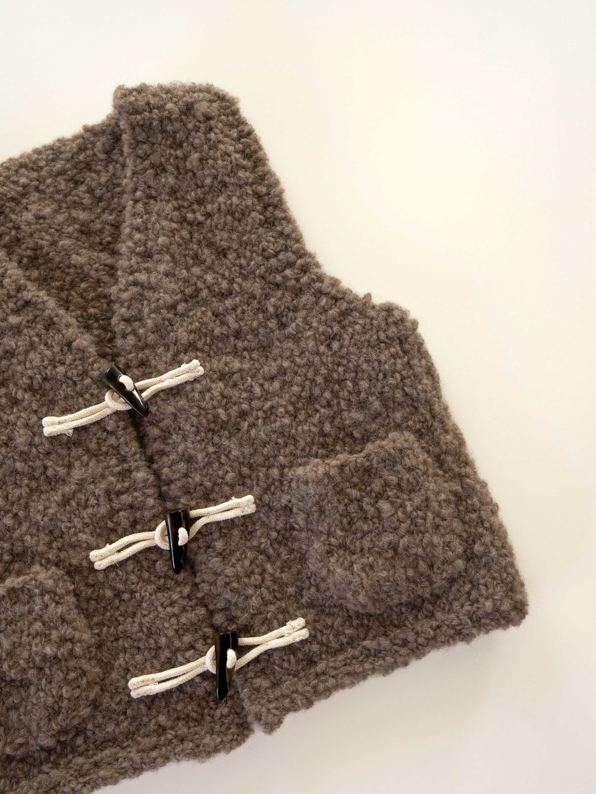 A duffle vest worked in boucle yarn that is light and warm. The edges are finished in garter stitch instead of a separate rib, preventing curling while allowing the piece to be worked in one continuous piece. The highland alpaca boucle traps air for softness, warmth, and lightness when worn. Video tutorials are provided for the cast-on, attaching duffle buttons, and adding pockets. The bulky yarn allows for quick completion. While the pattern itself is easy, the yarn can be tricky, so it is recommended for knitters comfortable with both knit and purl stitches.