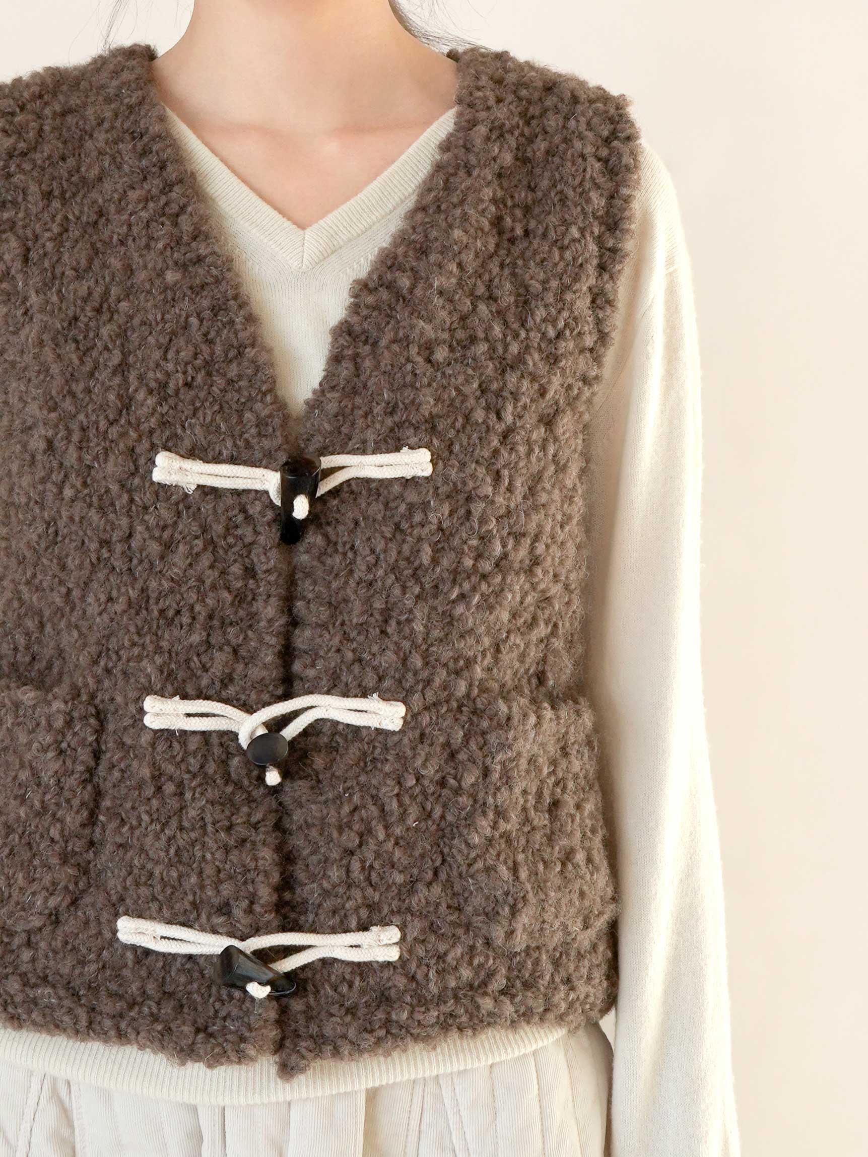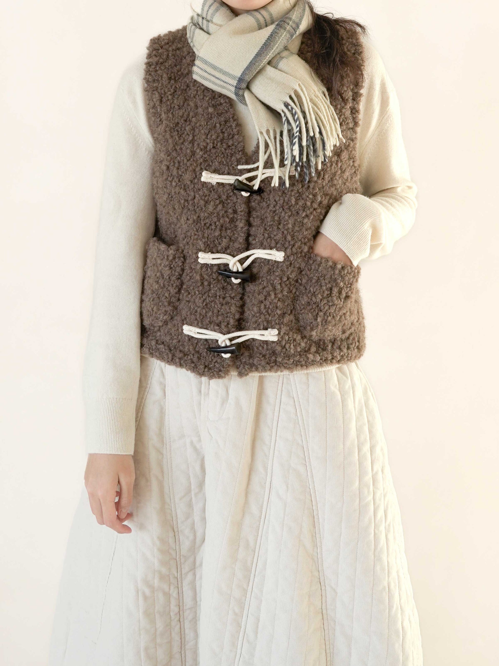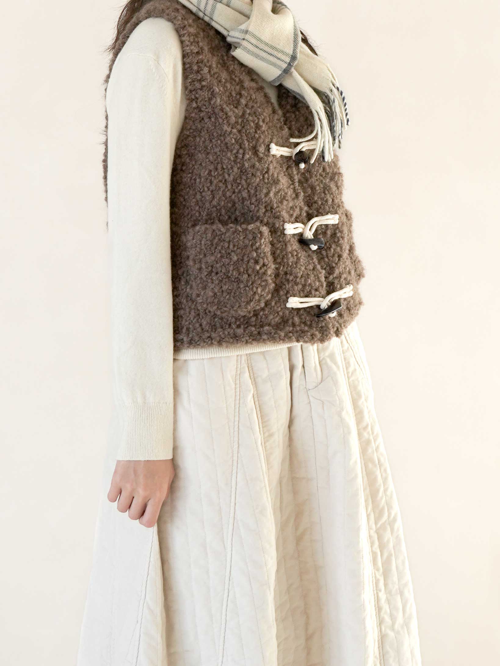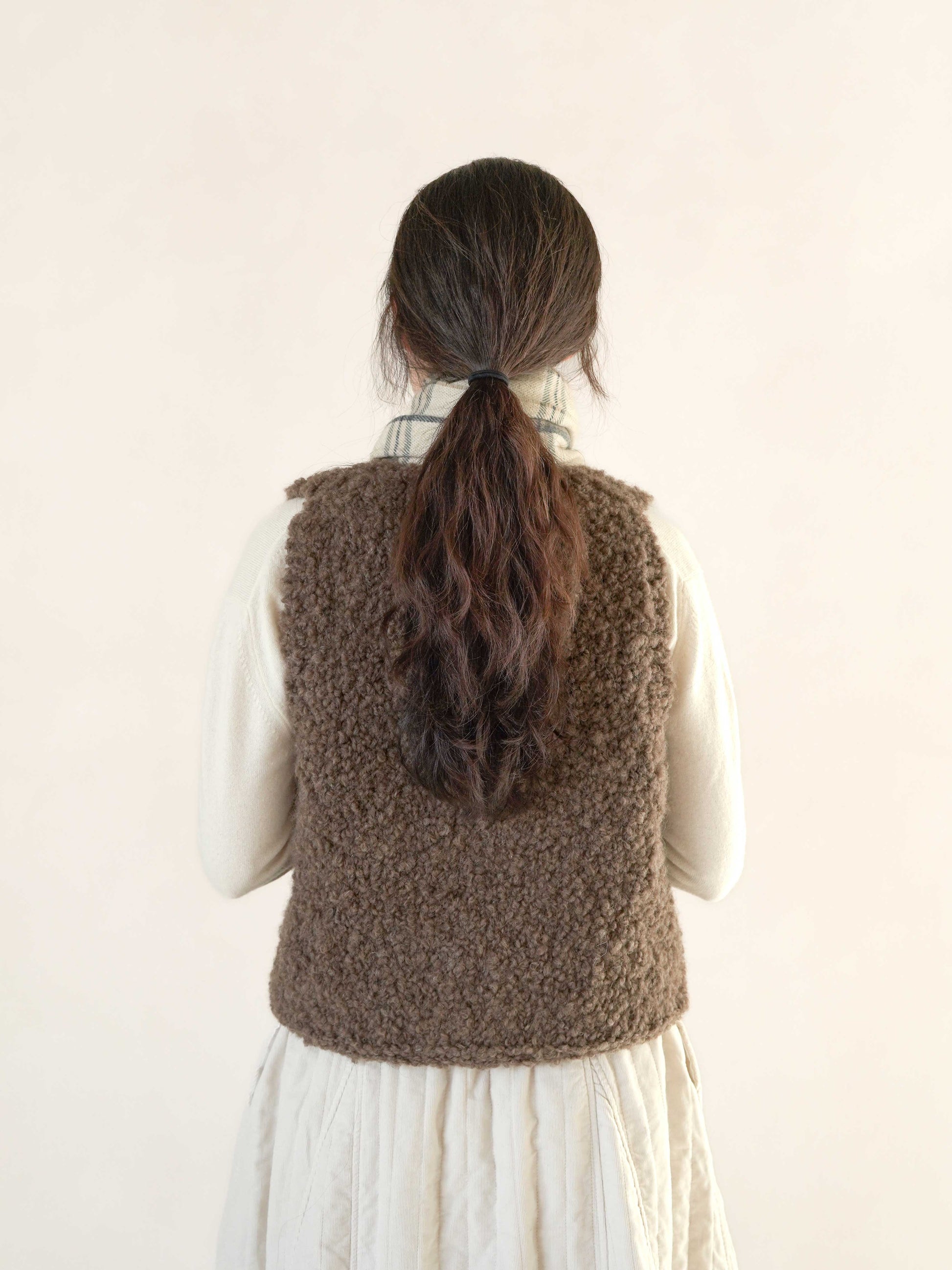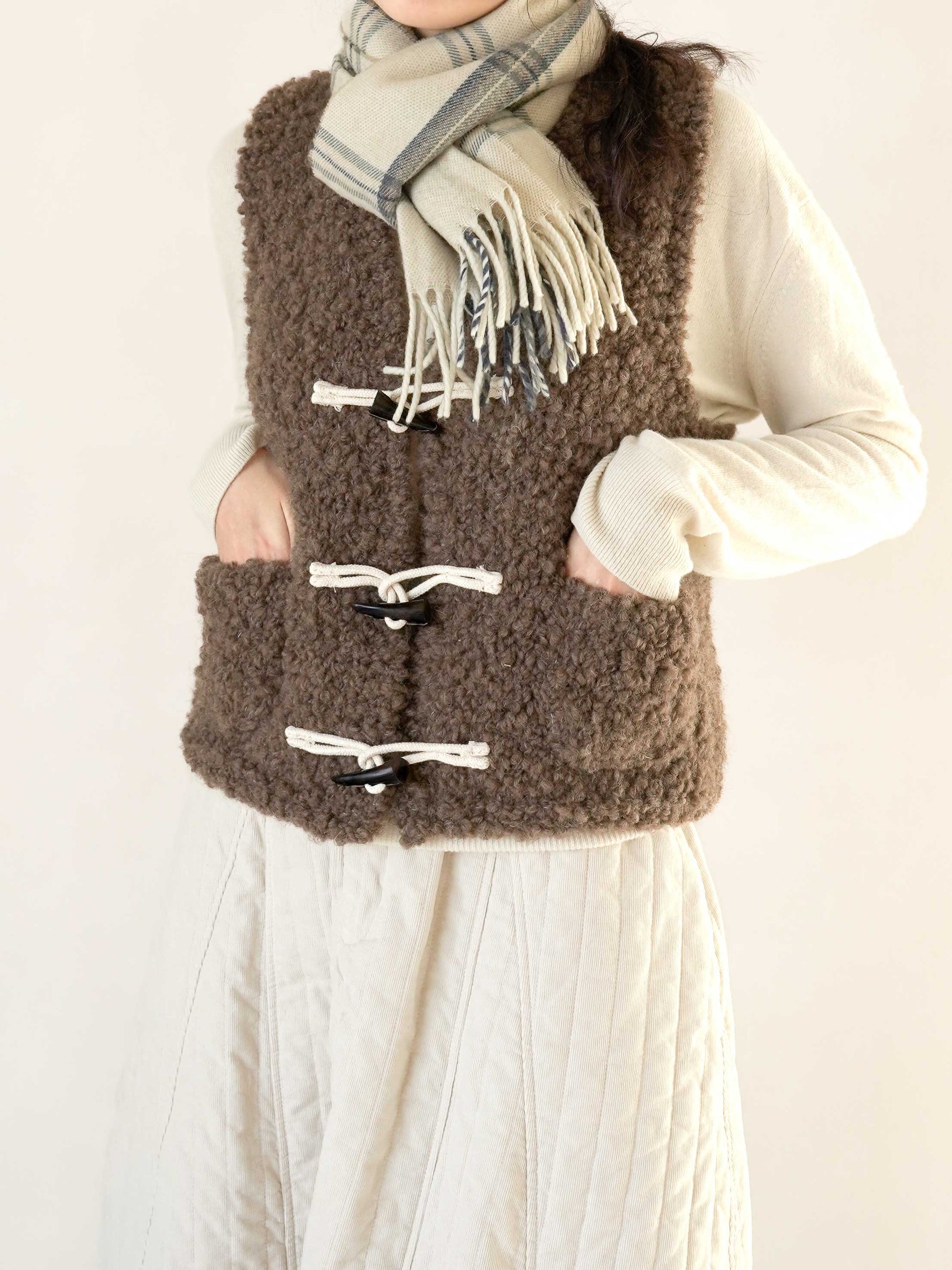 A duffle vest worked in boucle yarn that is light and warm. The edges are finished in garter stitch instead of a separate rib, preventing curling while allowing the piece to be worked in one continuous piece. The highland alpaca boucle traps air for softness, warmth, and lightness when worn. Video tutorials are provided for the cast-on, attaching duffle buttons, and adding pockets. The bulky yarn allows for quick completion. While the pattern itself is easy, the yarn can be tricky, so it is recommended for knitters comfortable with both knit and purl stitches.