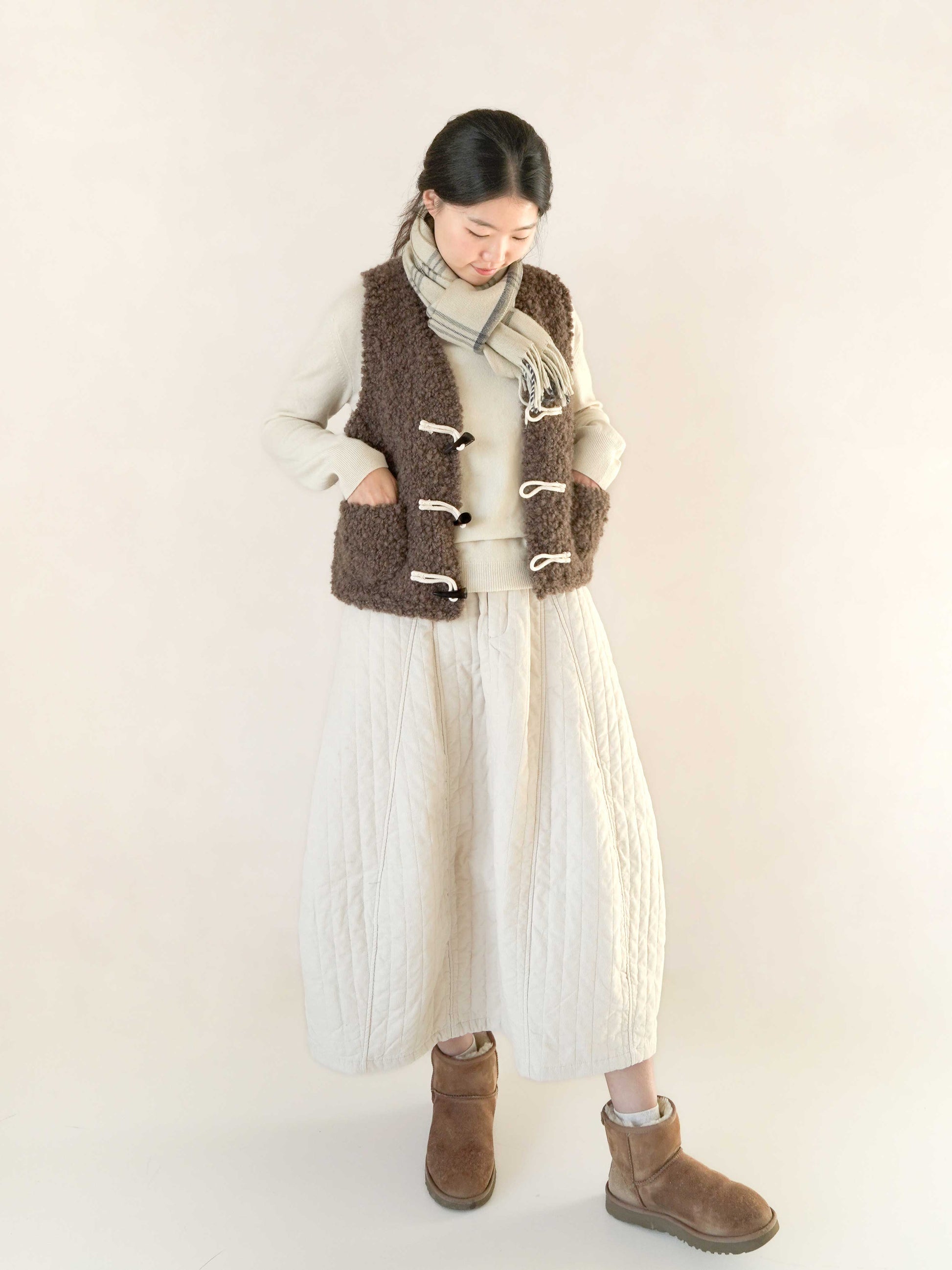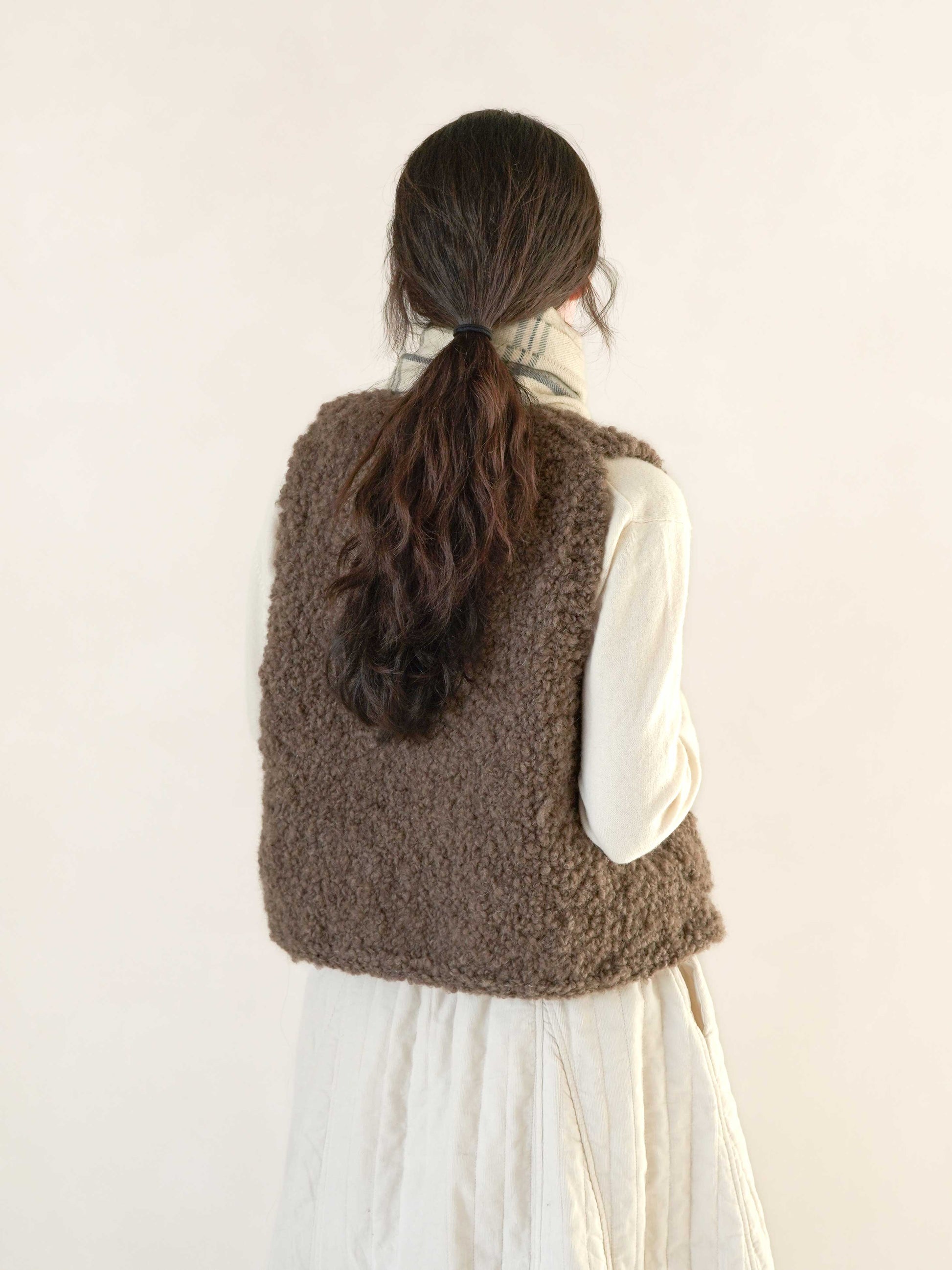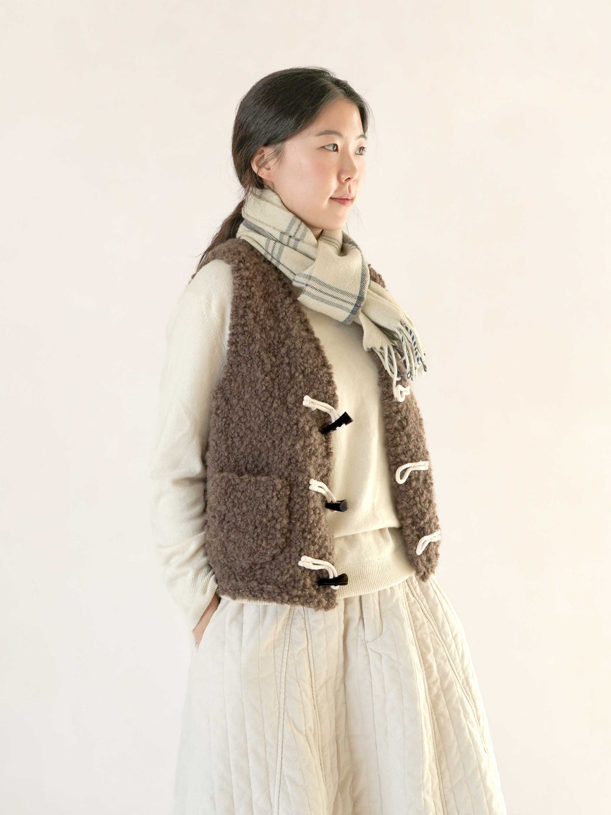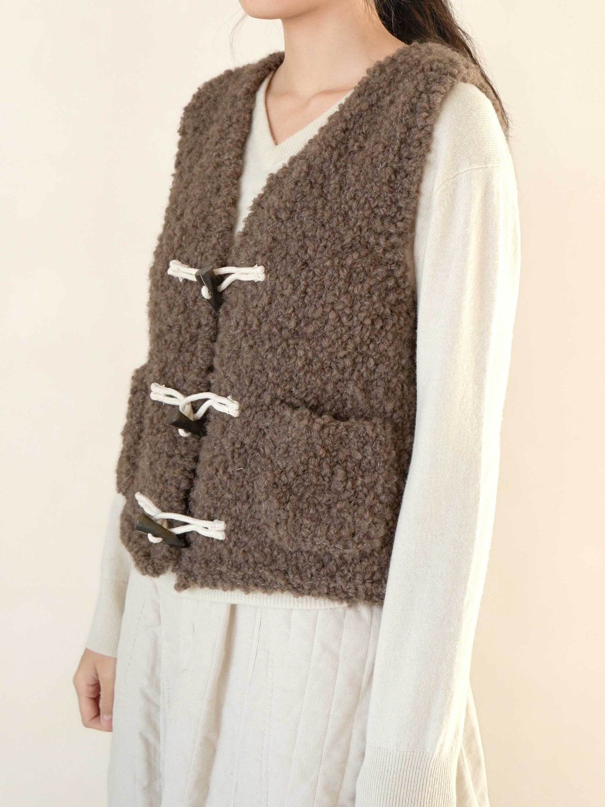 A duffle vest worked in boucle yarn that is light and warm. The edges are finished in garter stitch instead of a separate rib, preventing curling while allowing the piece to be worked in one continuous piece. The highland alpaca boucle traps air for softness, warmth, and lightness when worn. Video tutorials are provided for the cast-on, attaching duffle buttons, and adding pockets. The bulky yarn allows for quick completion. While the pattern itself is easy, the yarn can be tricky, so it is recommended for knitters comfortable with both knit and purl stitches.