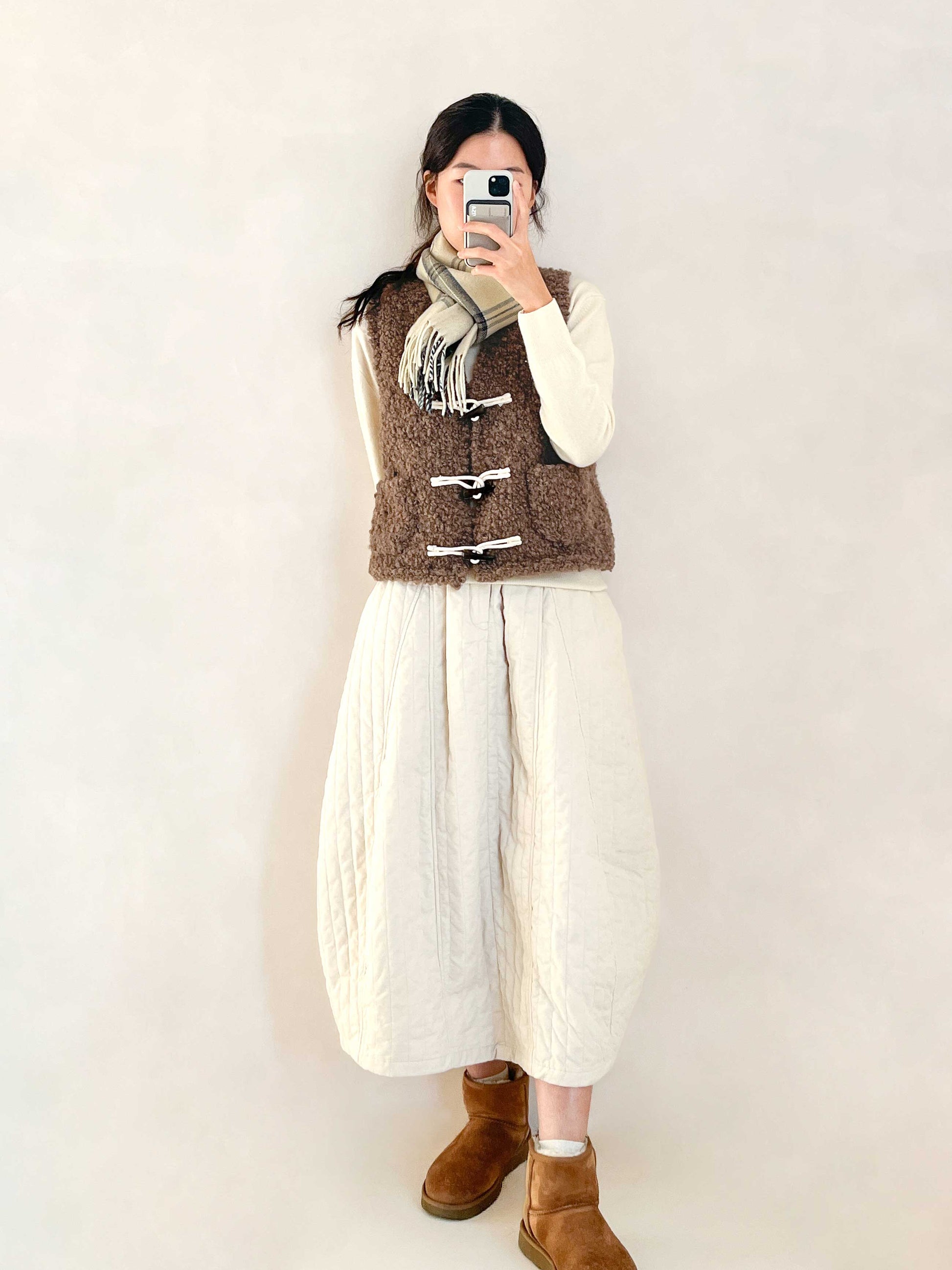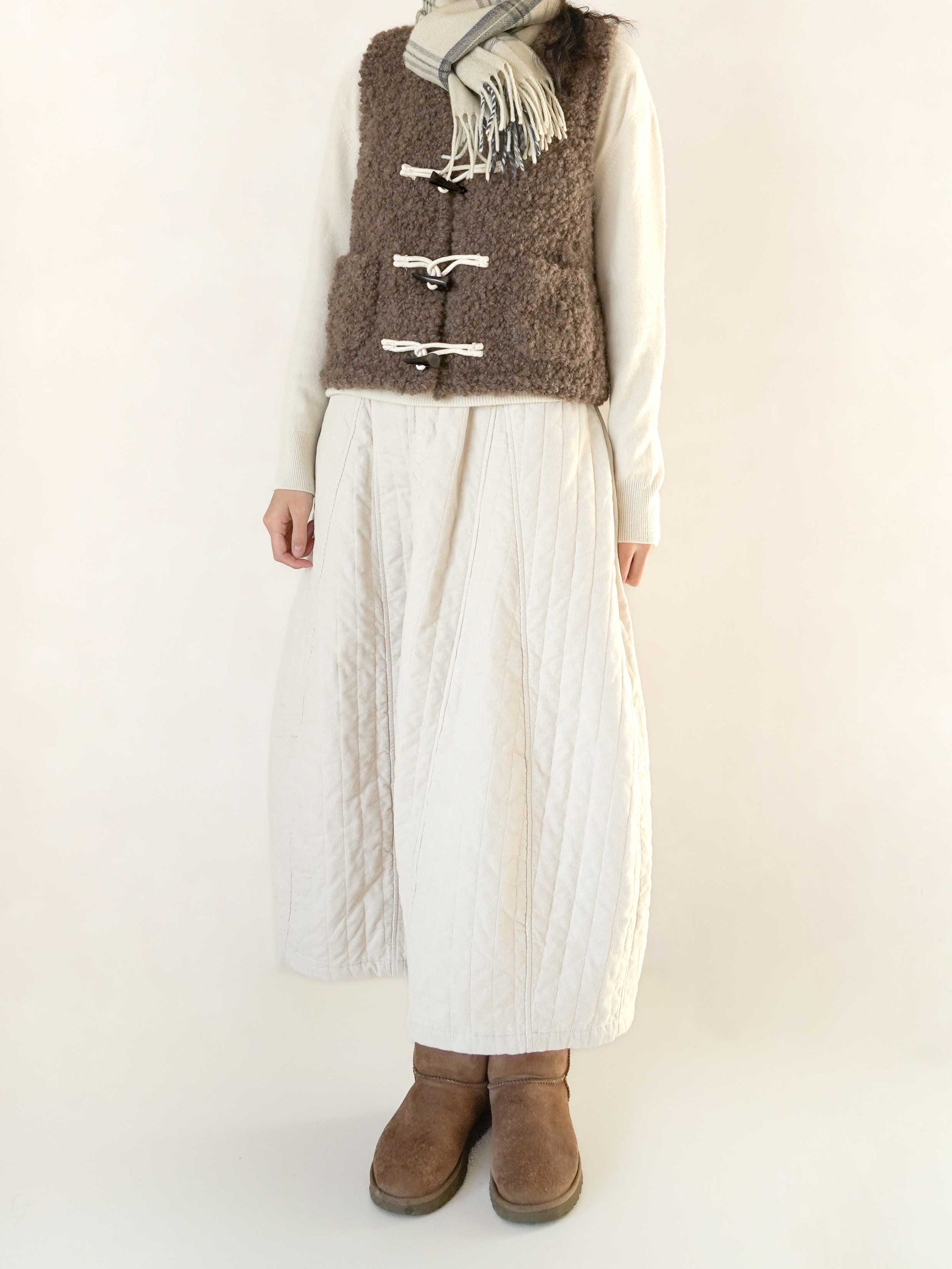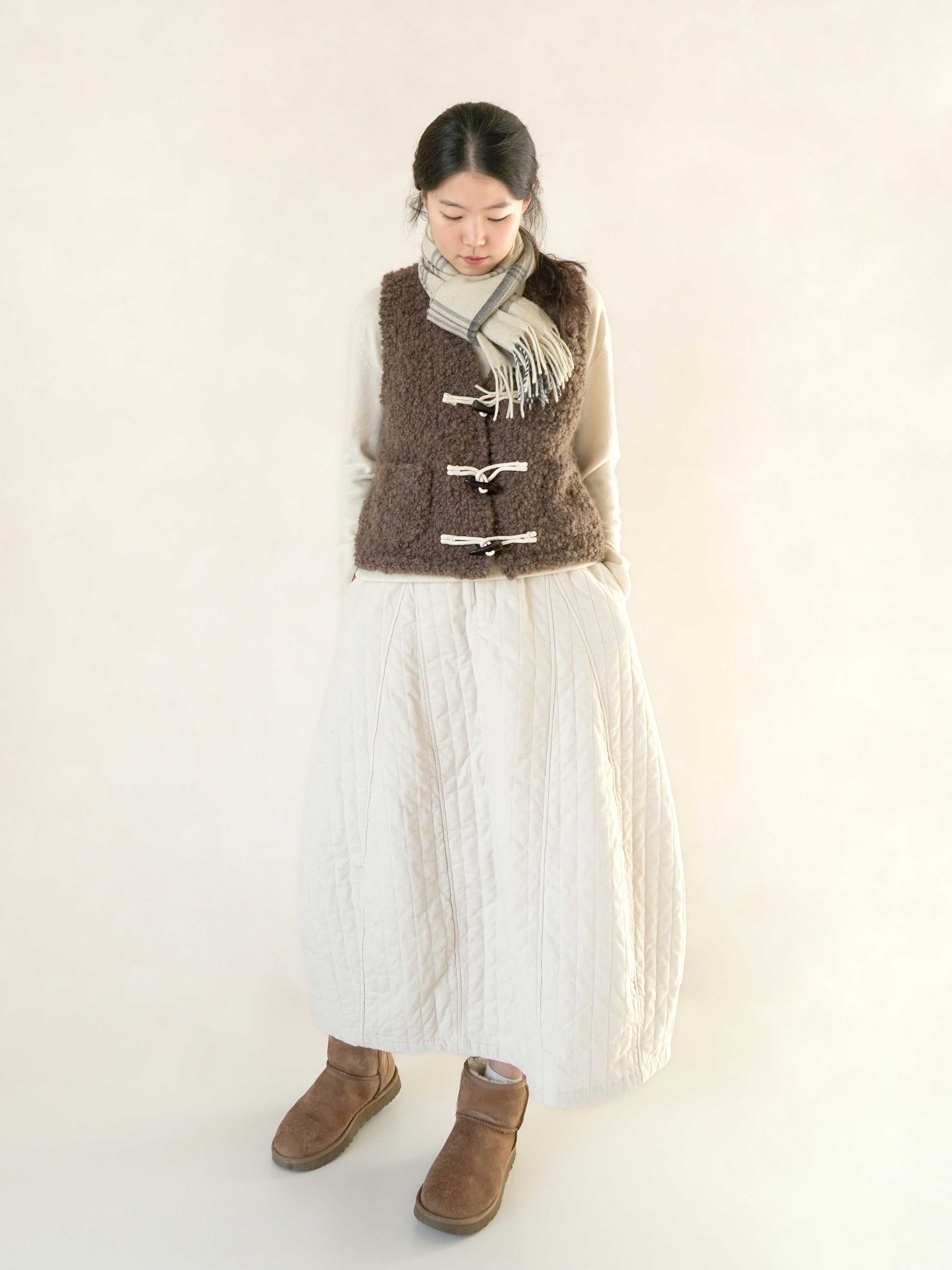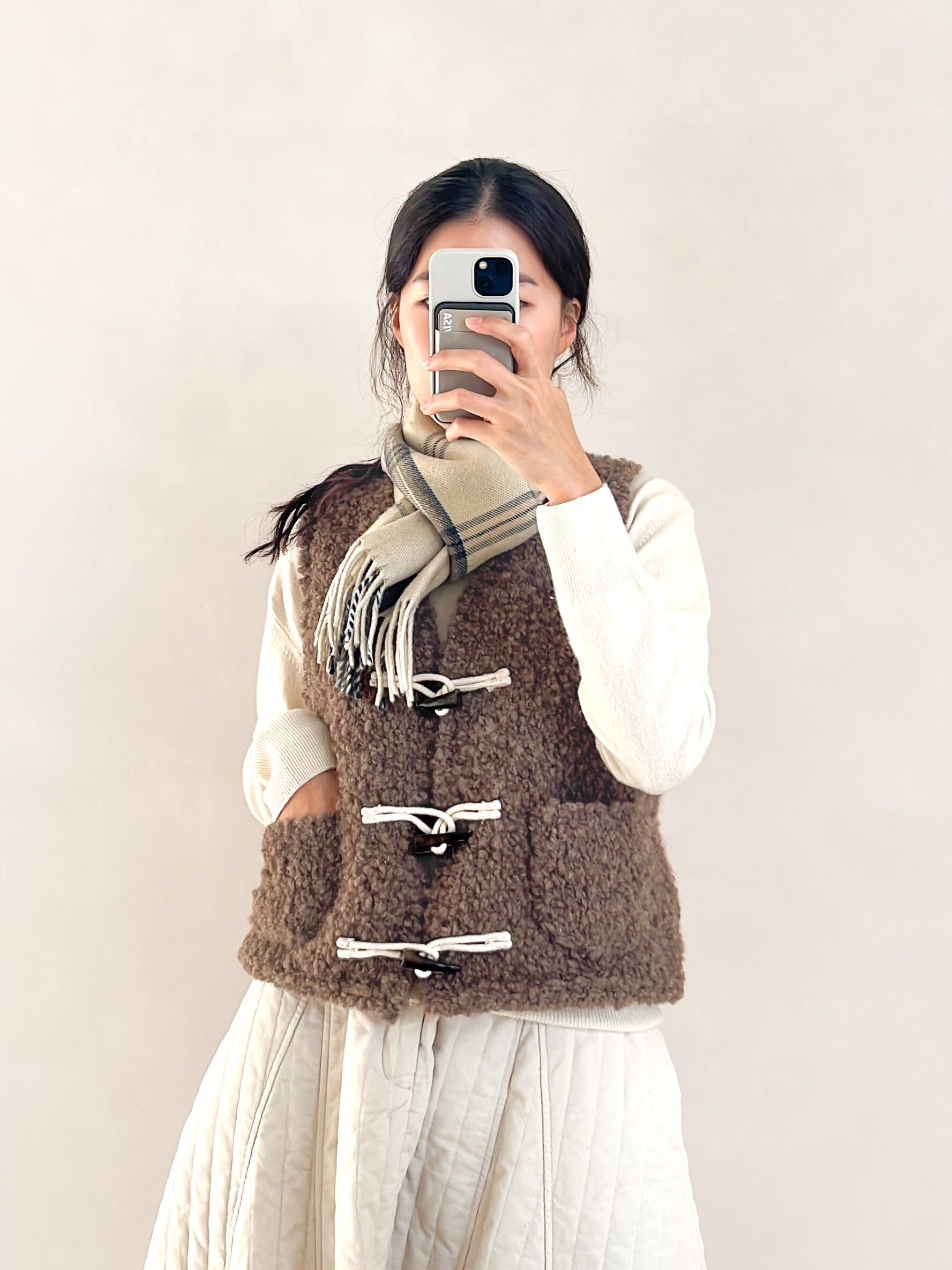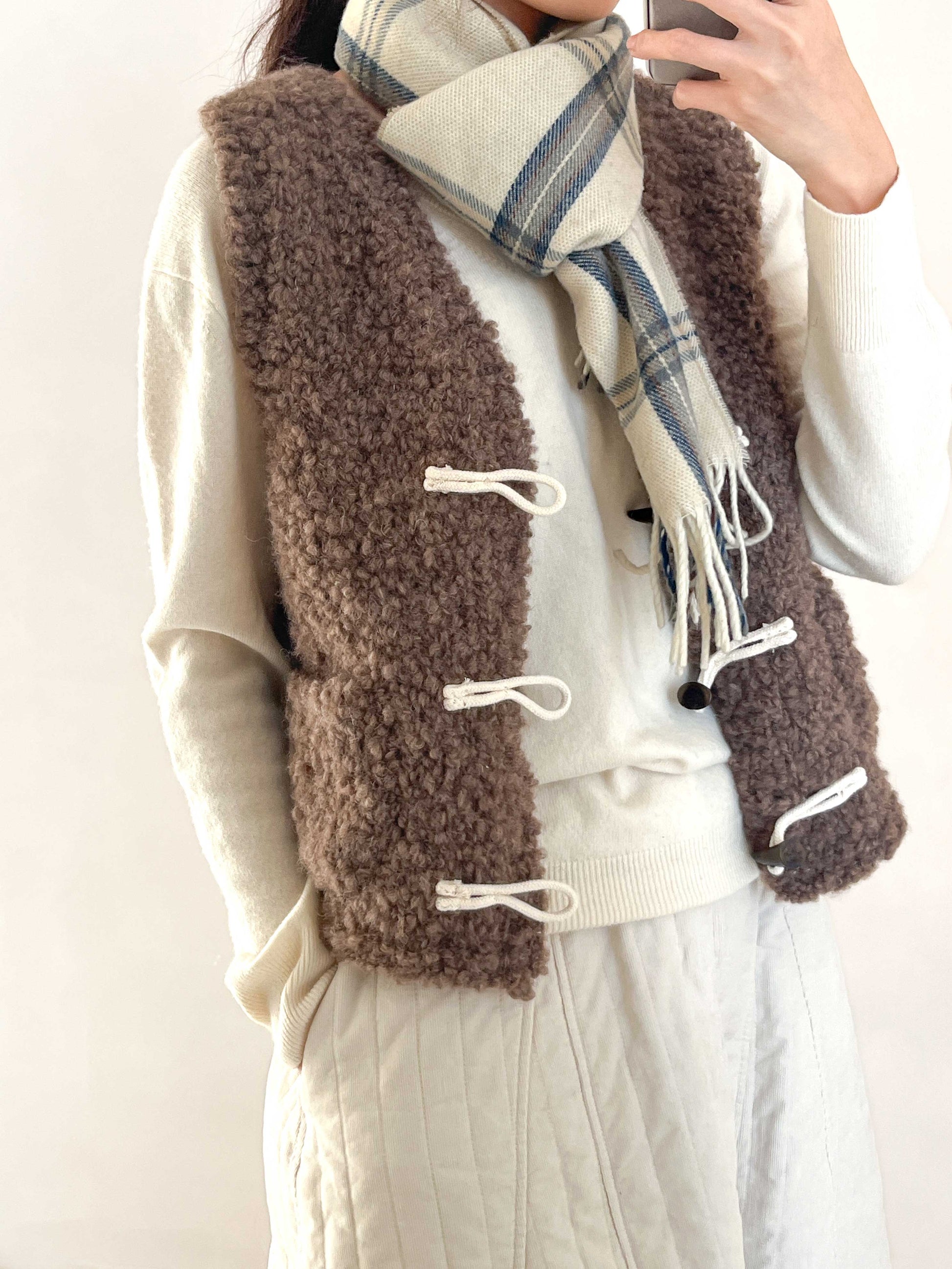 A duffle vest worked in boucle yarn that is light and warm. The edges are finished in garter stitch instead of a separate rib, preventing curling while allowing the piece to be worked in one continuous piece. The highland alpaca boucle traps air for softness, warmth, and lightness when worn. Video tutorials are provided for the cast-on, attaching duffle buttons, and adding pockets. The bulky yarn allows for quick completion. While the pattern itself is easy, the yarn can be tricky, so it is recommended for knitters comfortable with both knit and purl stitches.