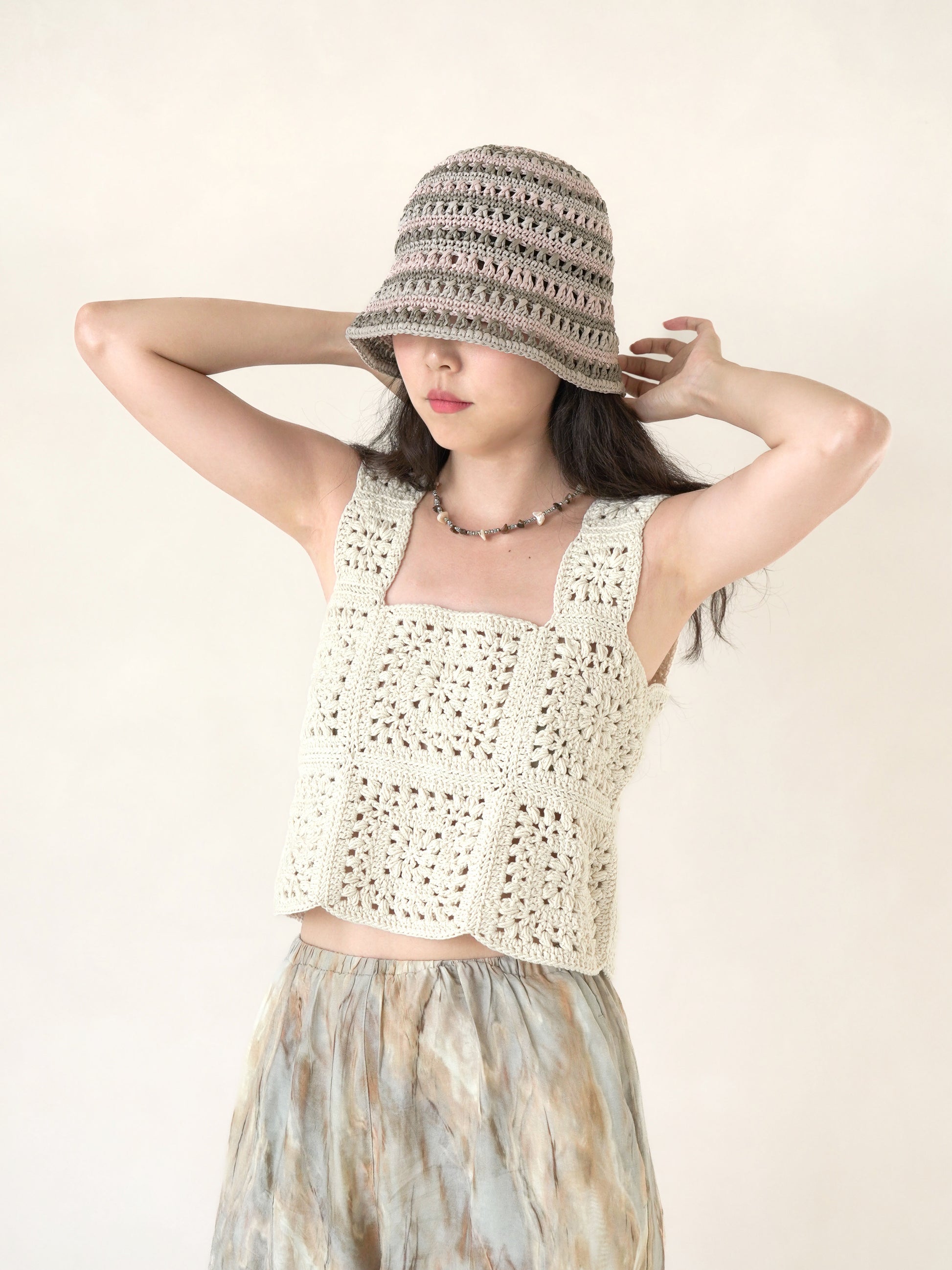 짧은뜨기, 교차뜨기를 섞어가며 뜨는 버킷햇입니다. 울지않는 동그란 쉐입과 딱 떨어지는 챙 디자인이 특징입니다. 다양한 기법과 배색때문에 난이도가 쉽지는 않은 편이며, 코바늘 원형뜨기 기초를 능숙하게 할줄 아시는 분들께 추천드리는 패키지입니다. 2시간 17분 길이의 동영상 강의가 제공되며, 유튜브 공개 동영상으로 미리 동영상을 시청하시면서 난이도를 체크해보시기 바랍니다