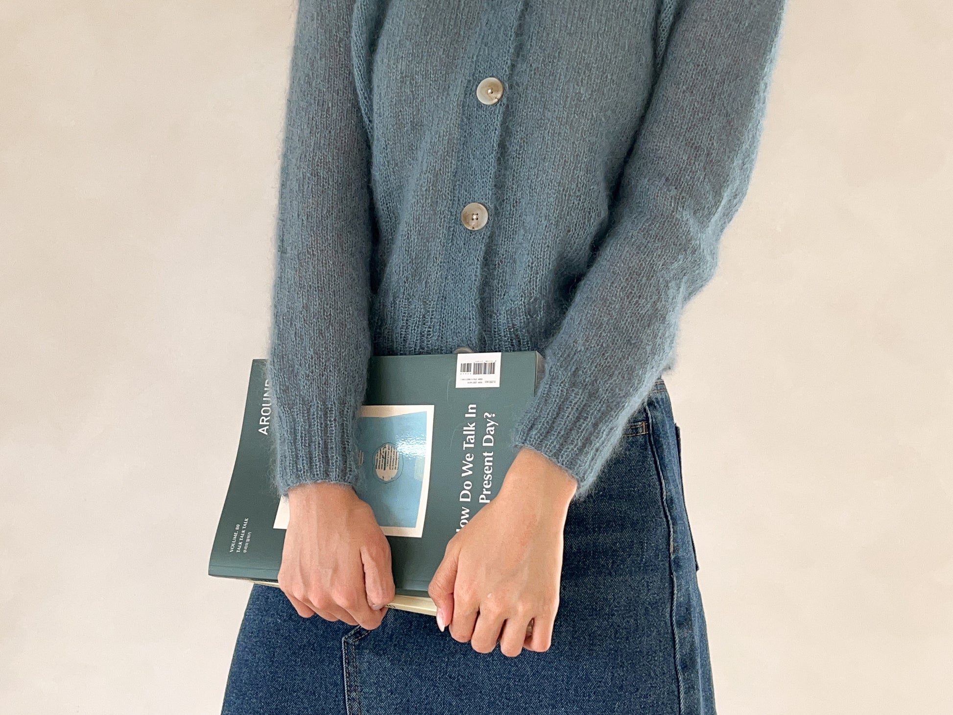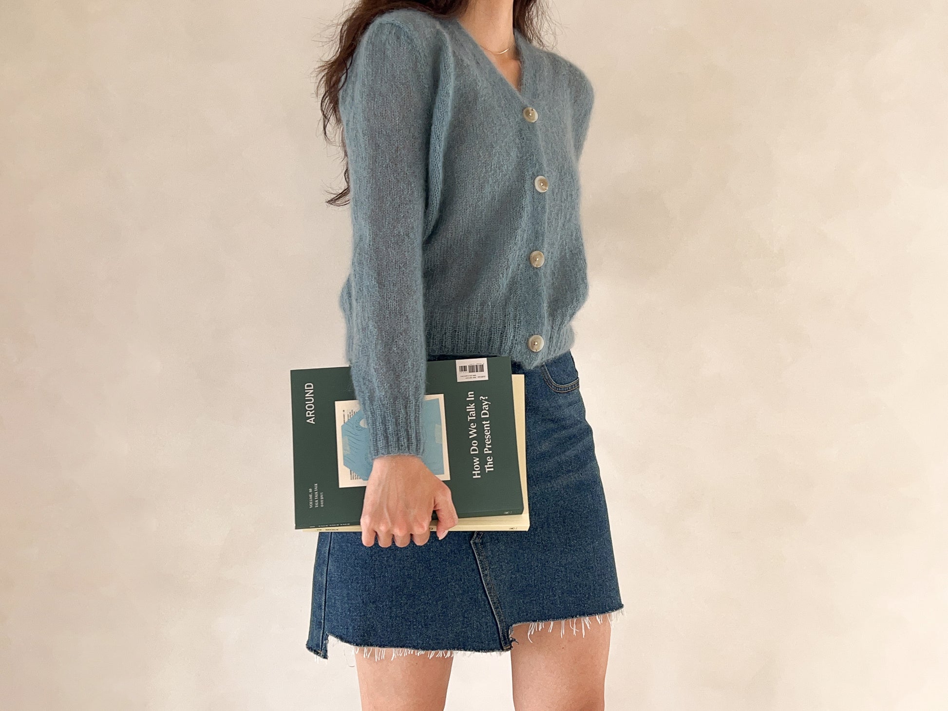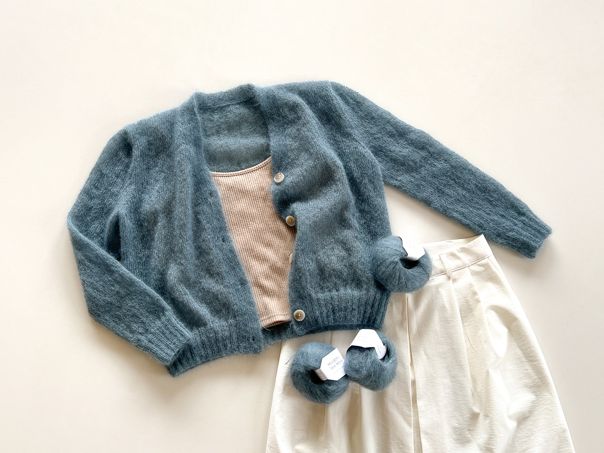 This cardigan is worked in pieces — back, front, and sleeves — and then seamed together. It features the distinct shoulder line and neatly shaped sleeve cap that only a bottom-up construction can offer. The double-knitted button band gives a clean and structured finish. Worked with a single strand of Mulberry Silk Mohair, it creates a soft and voluminous texture, resulting in a refined and elegant garment even with just one strand. The pattern combines written and charted instructions, making it accessible for knitters who are familiar with reading patterns.