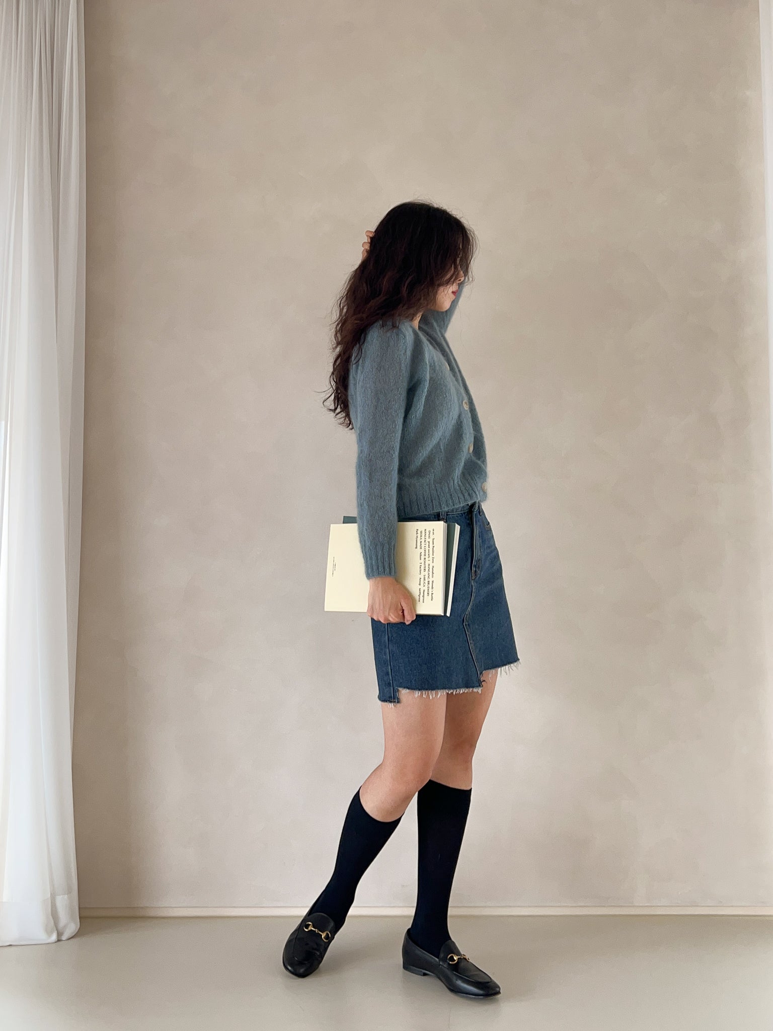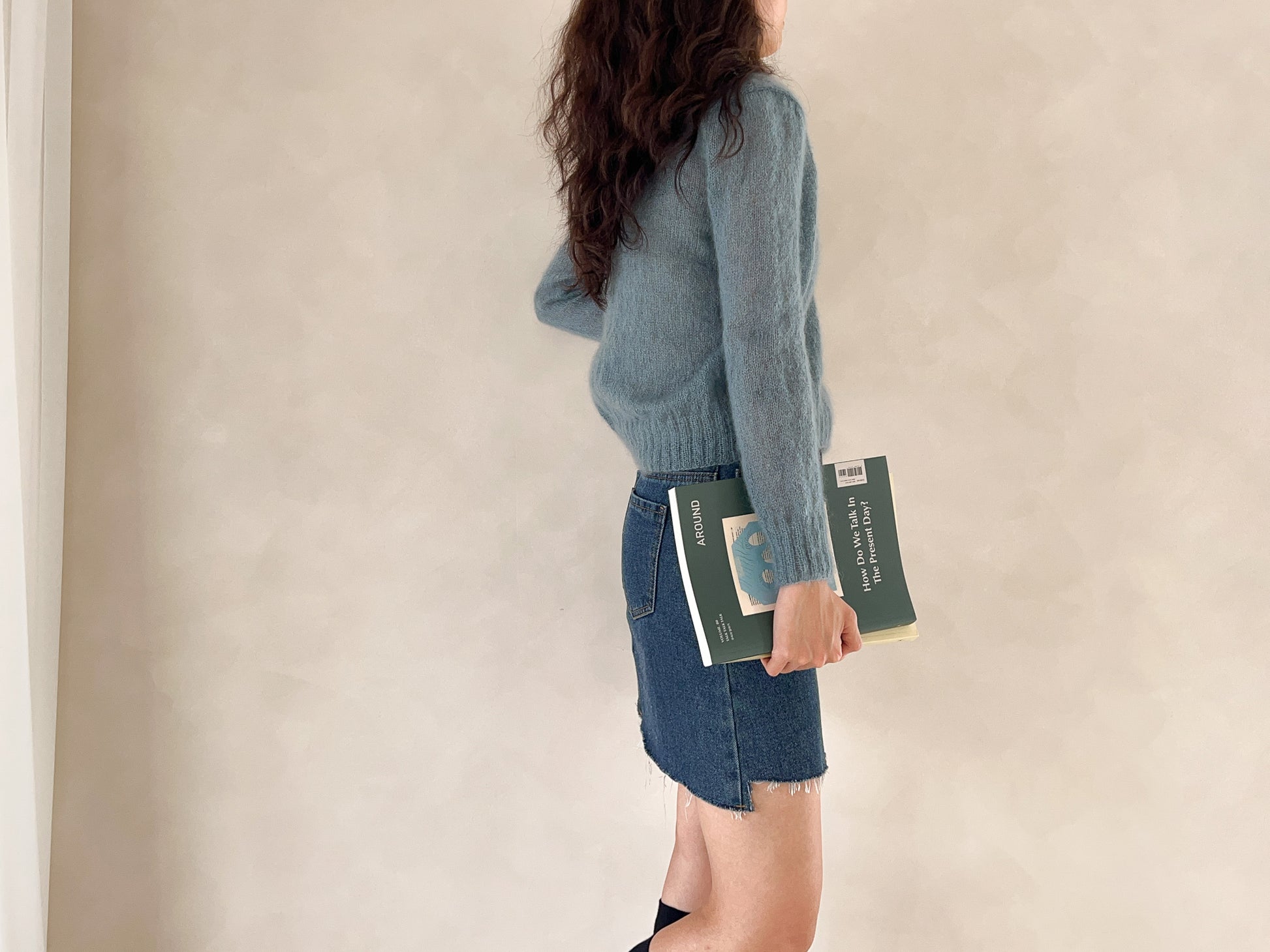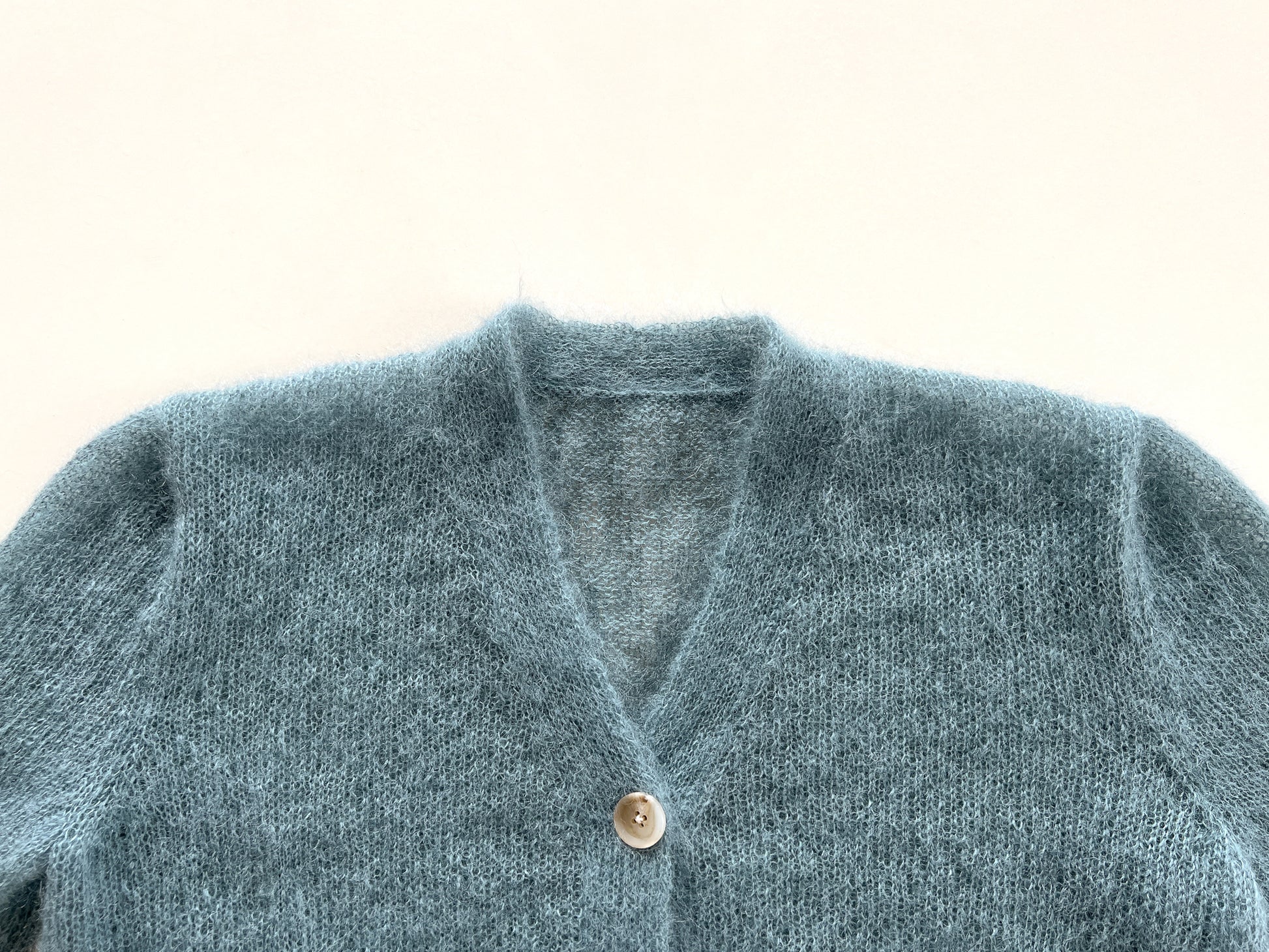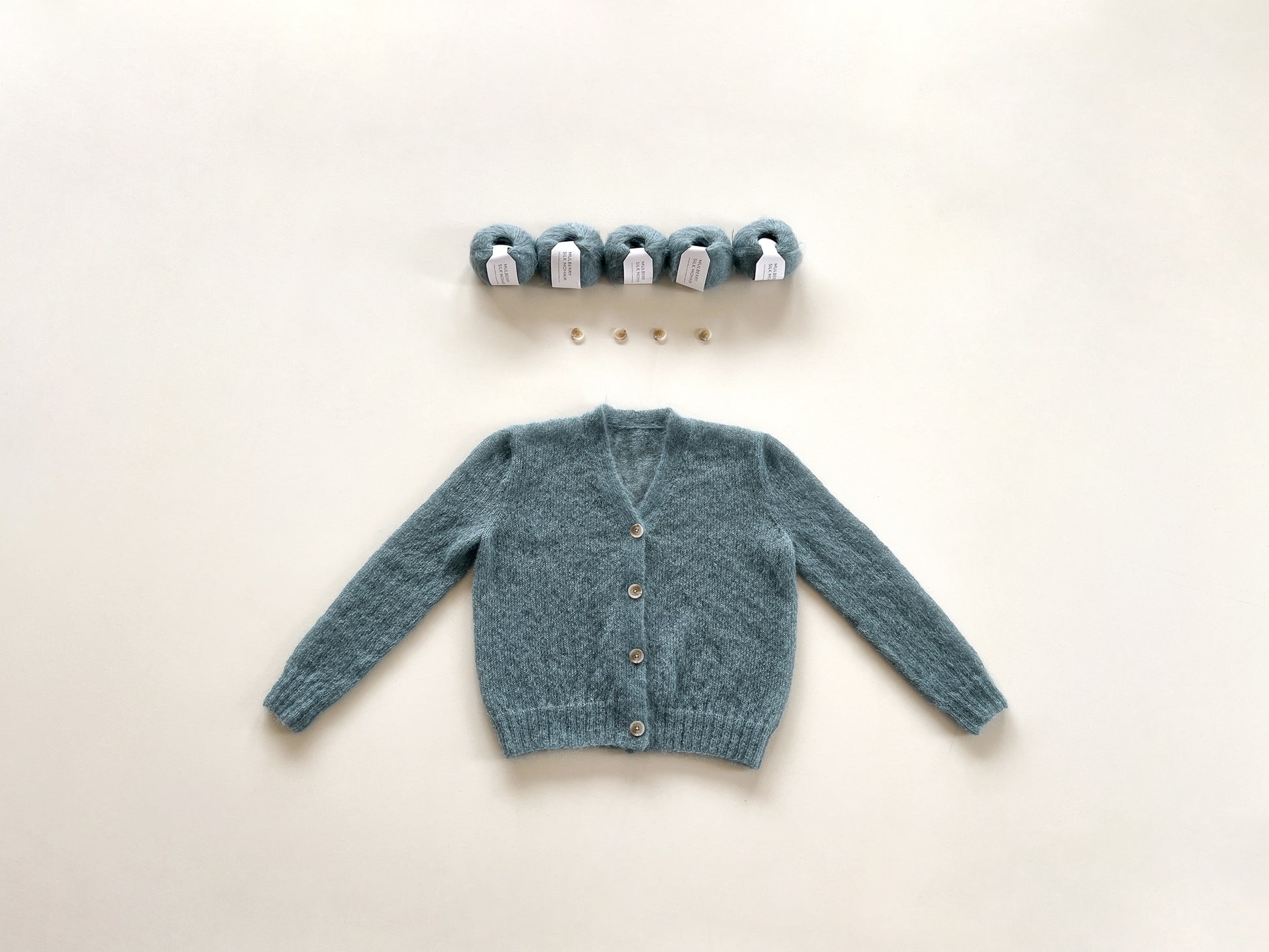 This cardigan is worked in pieces — back, front, and sleeves — and then seamed together. It features the distinct shoulder line and neatly shaped sleeve cap that only a bottom-up construction can offer. The double-knitted button band gives a clean and structured finish. Worked with a single strand of Mulberry Silk Mohair, it creates a soft and voluminous texture, resulting in a refined and elegant garment even with just one strand. The pattern combines written and charted instructions, making it accessible for knitters who are familiar with reading patterns.