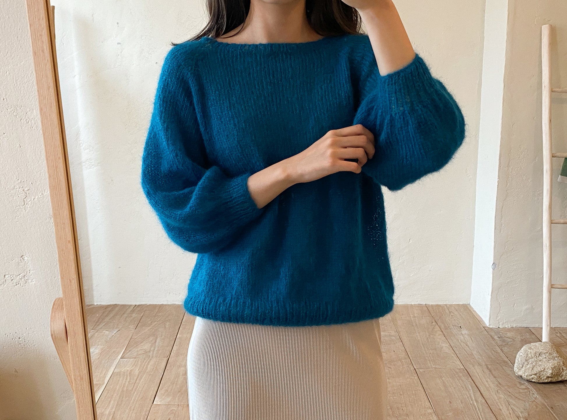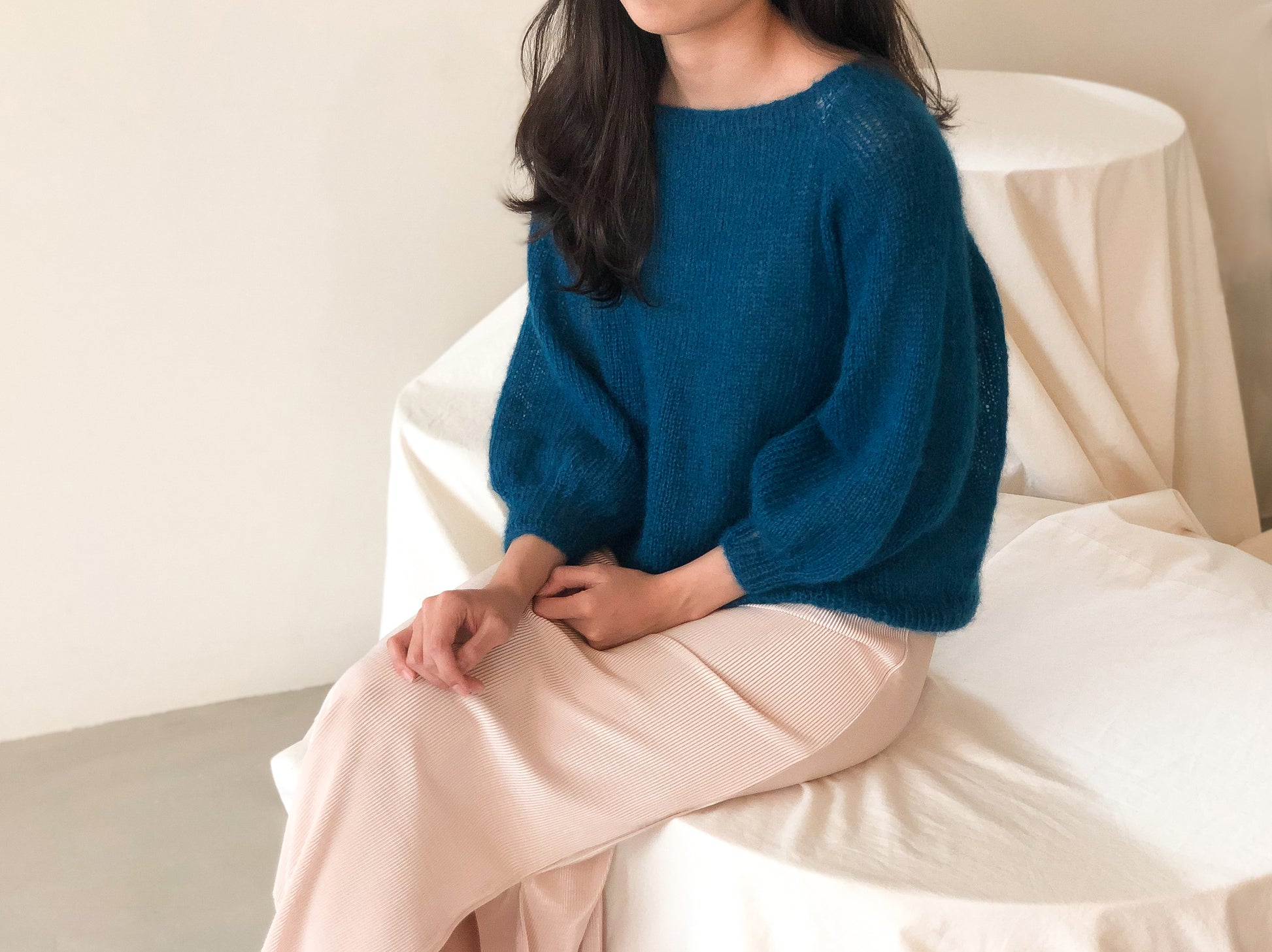 This is the mohair version of Banul Iyaki’s top-down bestseller, Phil Nuage Balloon Top-down. Enjoy an easy knitting process with five available sizes — simple and quick to complete. The ¾-length puff sleeves give the sweater a soft and feminine look.