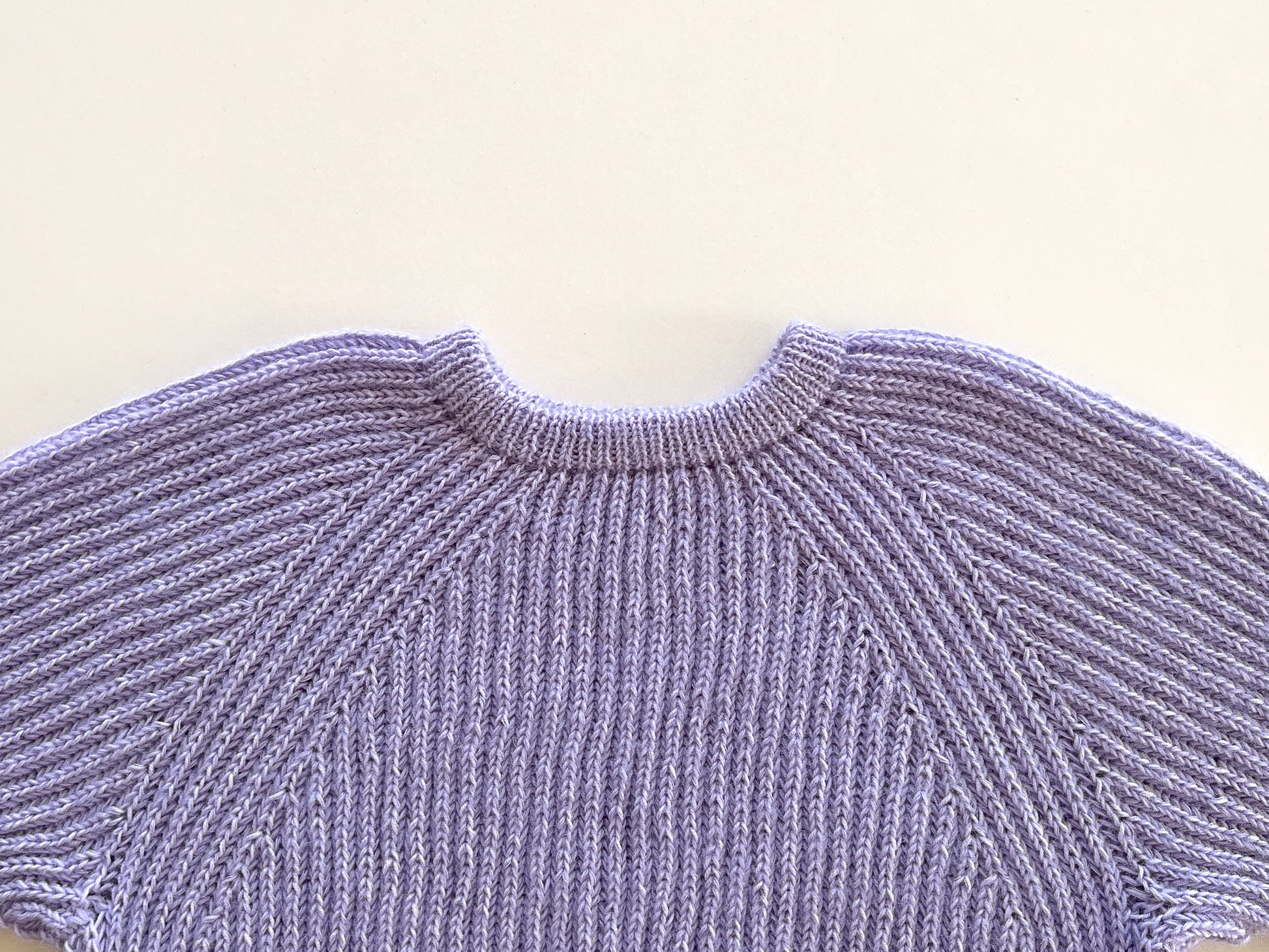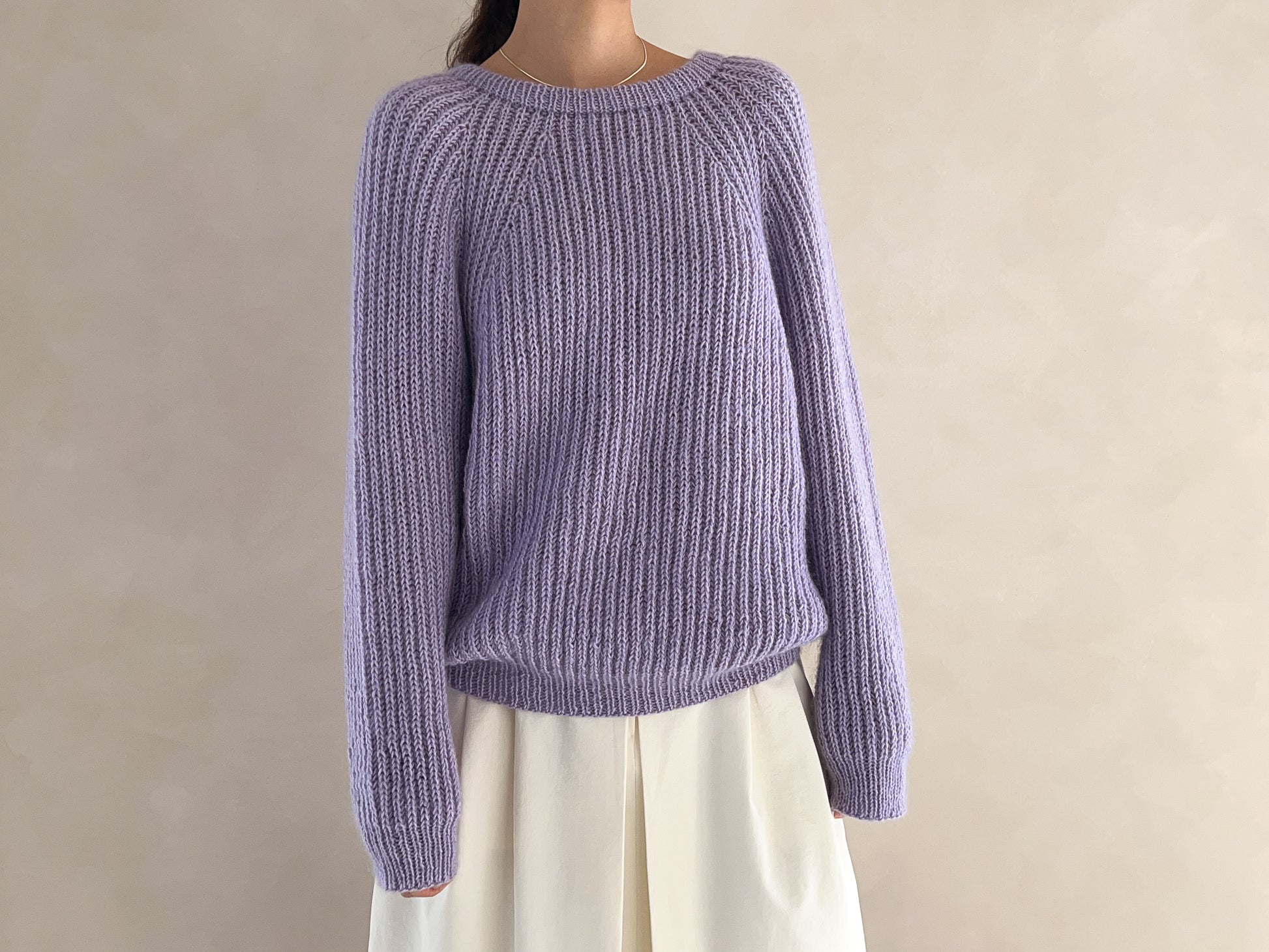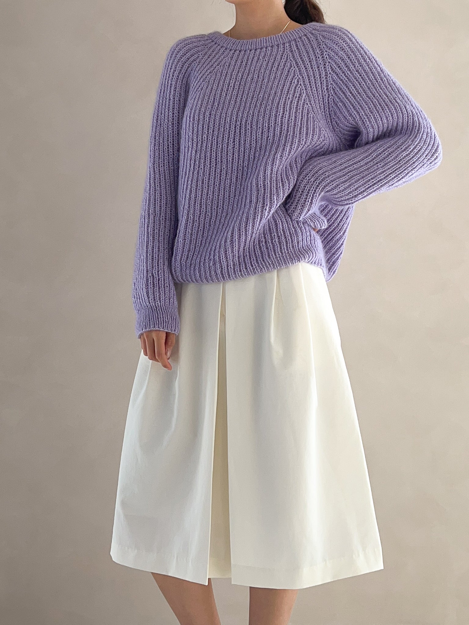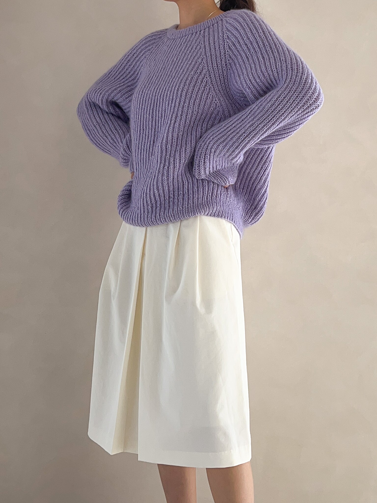 This is the winter version of the Short-sleeve Avo Brioche Top-down. A simple raglan-style brioche sweater, it features a ready-to-wear–like texture and a softly voluminous fabric that creates a beautiful fit when worn. Although it doesn’t include a separate raised back neckline, the wide raglan lines naturally form a gentle neckline. Designed with a relaxed fit, it can be comfortably worn by both men and women. Because brioche fabric stretches over time, the length may grow slightly as it’s worn. For this reason, it’s recommended to knit the body slightly shorter than your desired length. The fabric is also highly elastic, so choosing your regular size is recommended.