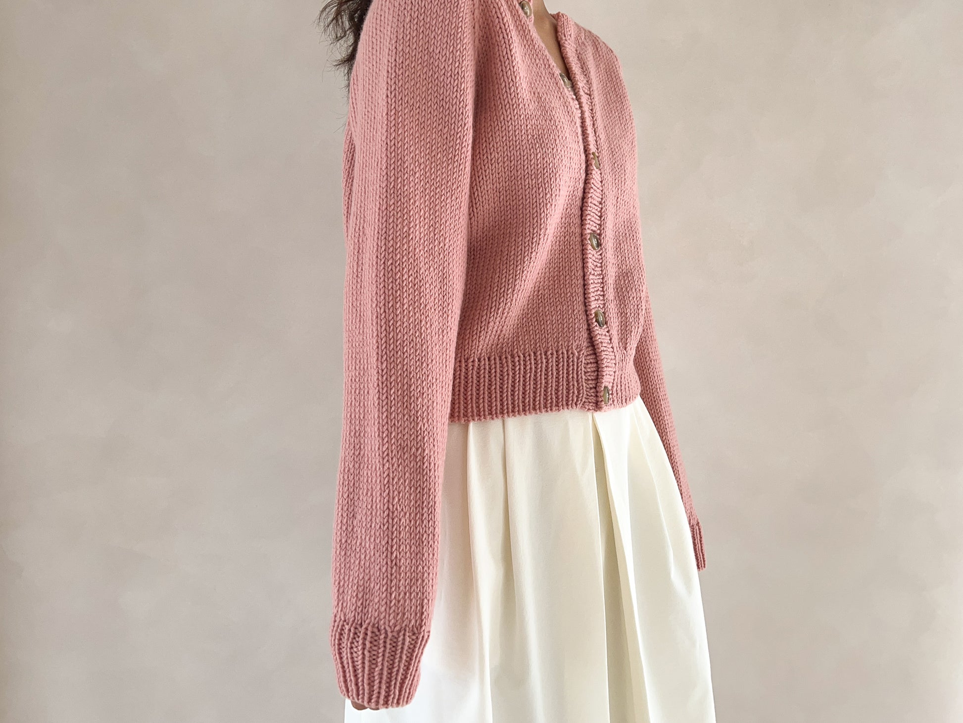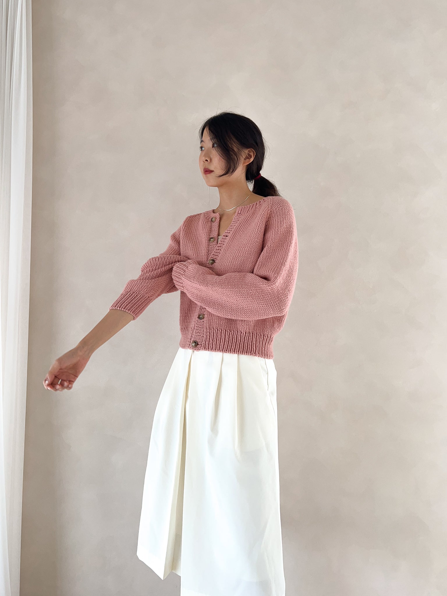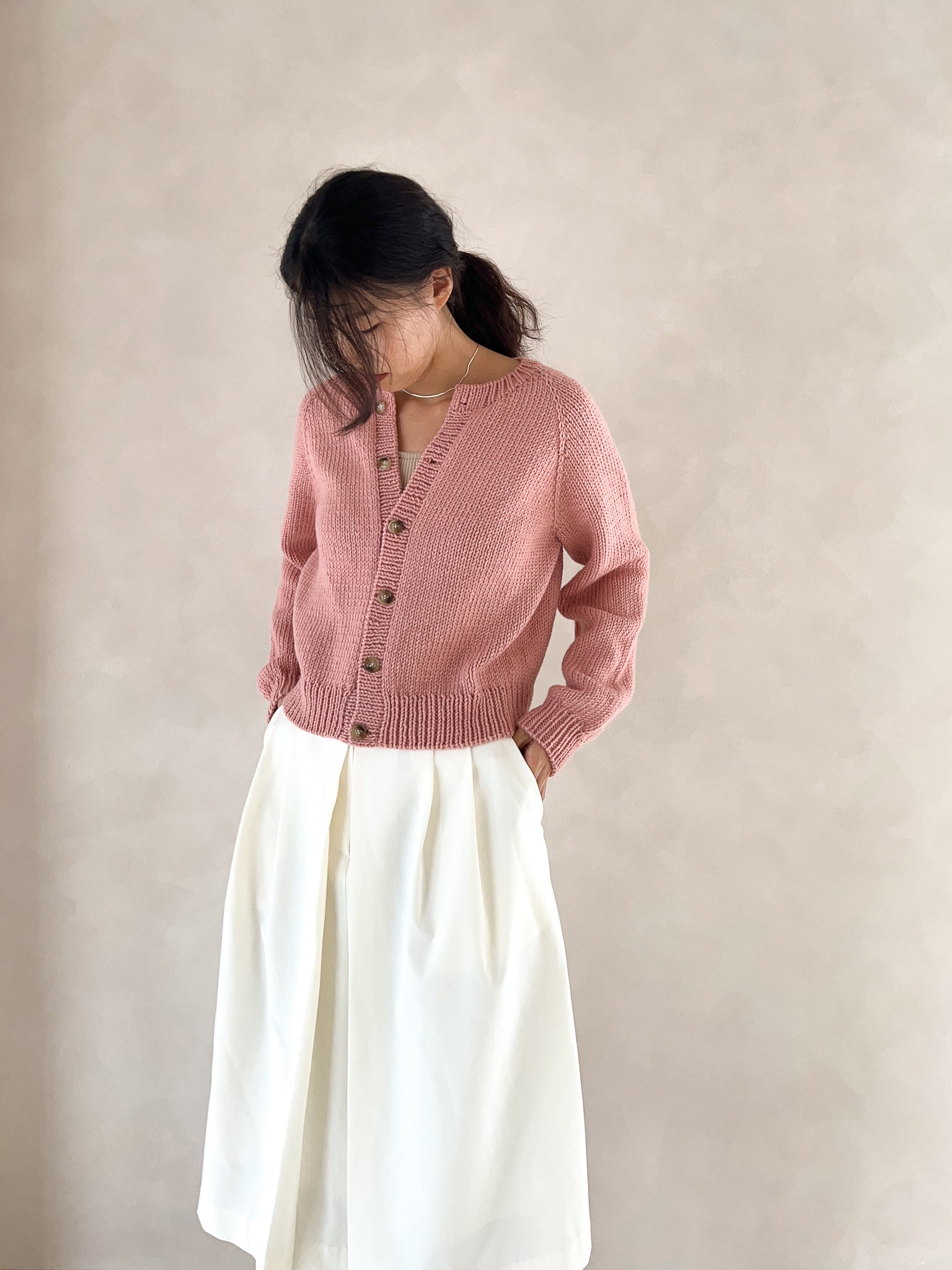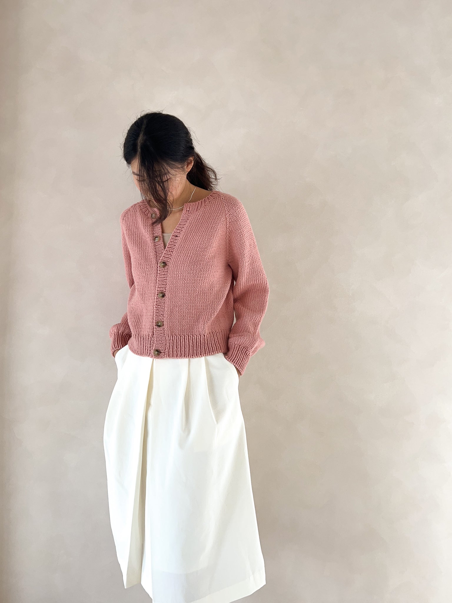 This is a basic raglan cardigan with a round neckline. It is worked top-down and features a natural neck line with a clean, simple design. Its versatile style makes it easy to pair with any outfit, and the thicker yarn allows for a quick finish. If you’re familiar with knit, purl, and increases, and feel comfortable following written instructions, this is a great beginner-friendly pattern. It is provided only as a written pattern and does not include a full video tutorial.