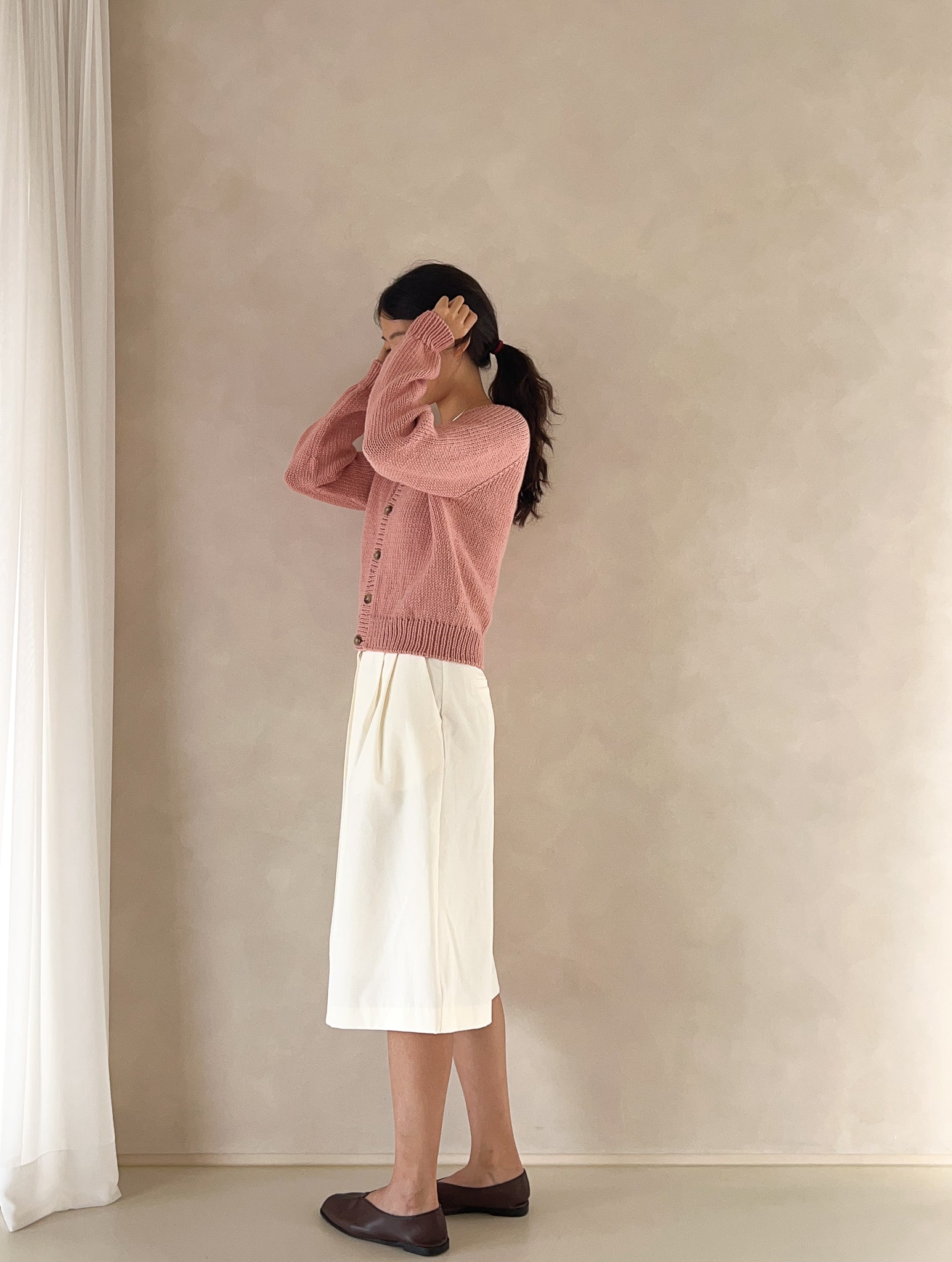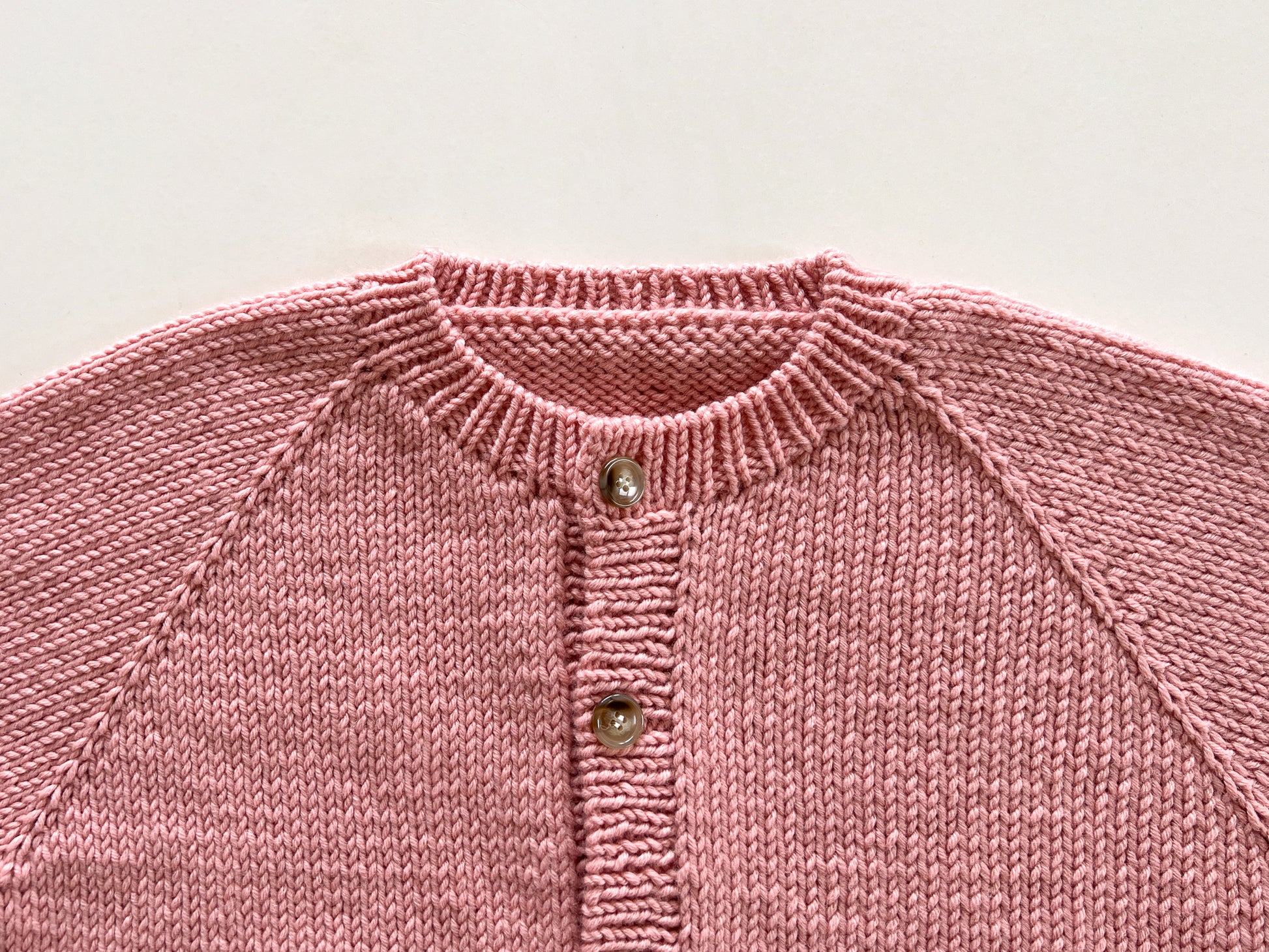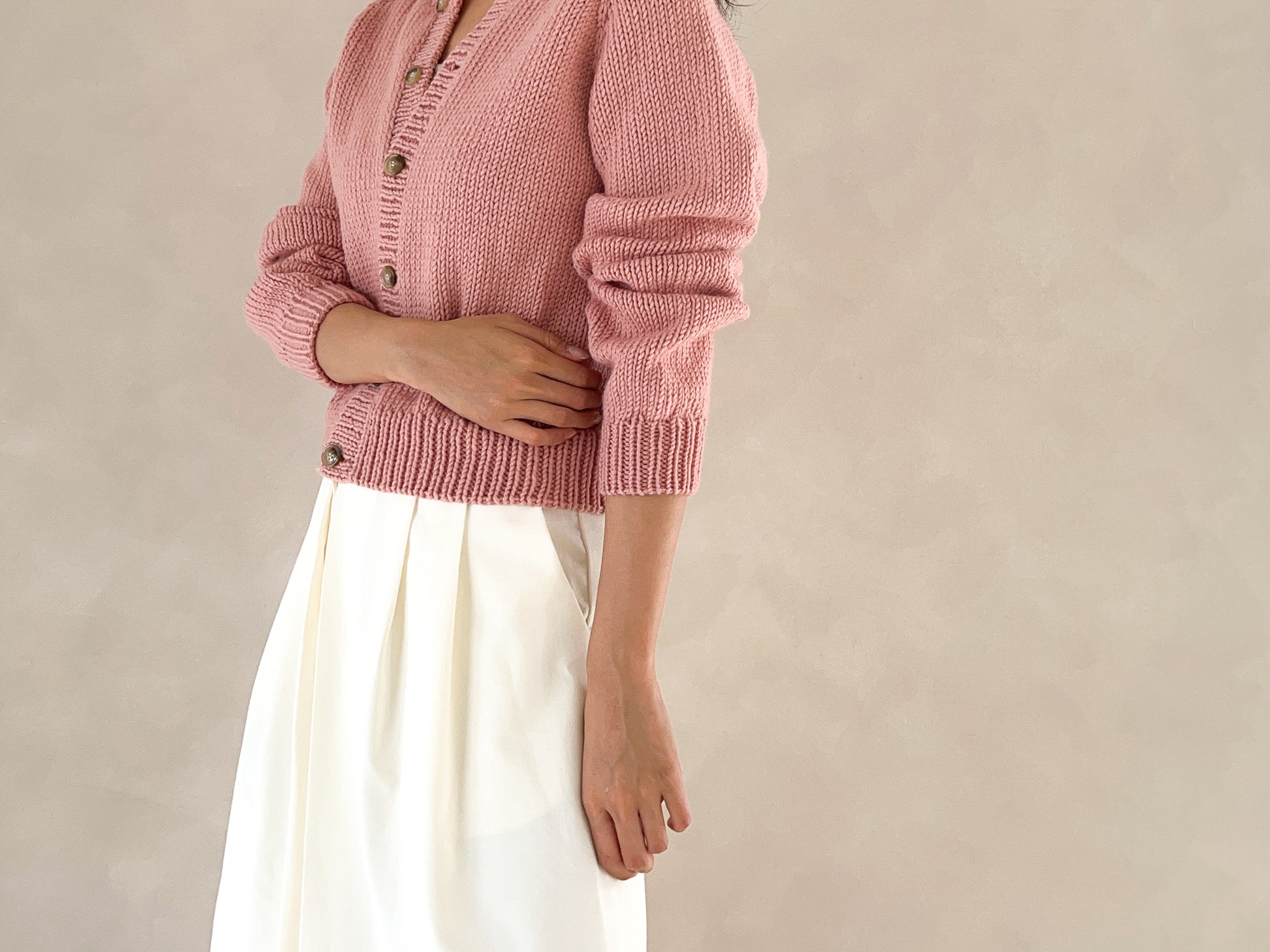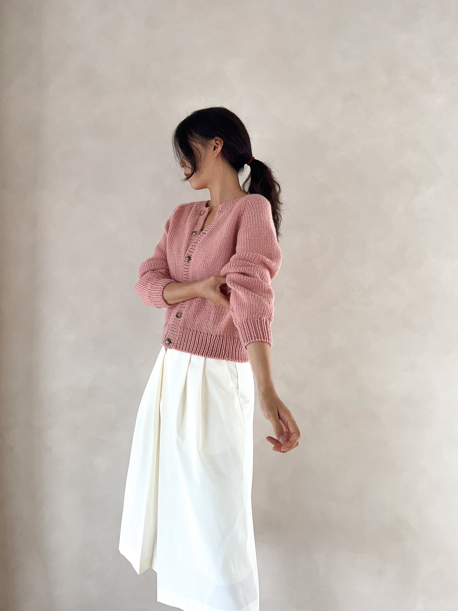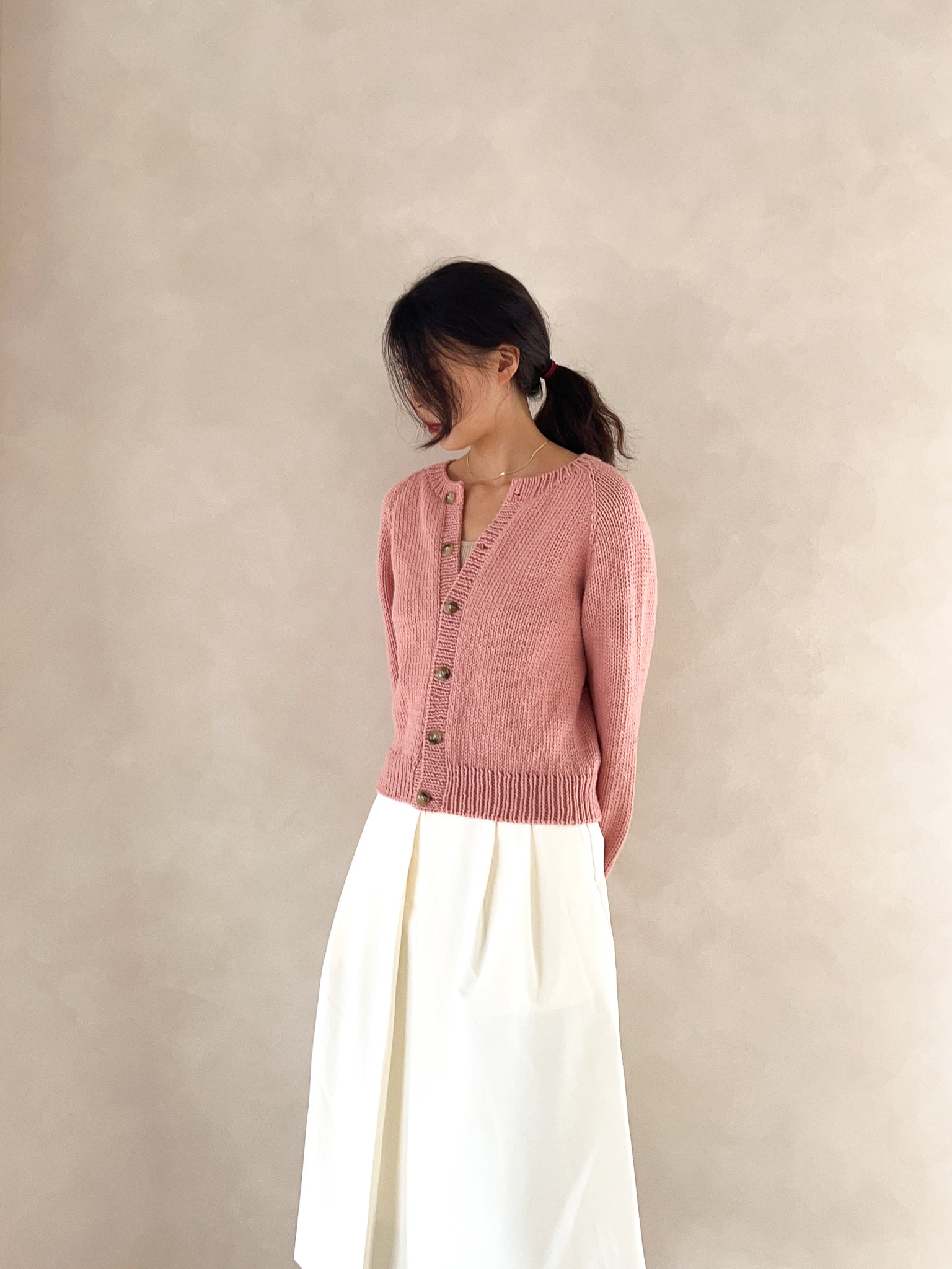 This is a basic raglan cardigan with a round neckline. It is worked top-down and features a natural neck line with a clean, simple design. Its versatile style makes it easy to pair with any outfit, and the thicker yarn allows for a quick finish. If you’re familiar with knit, purl, and increases, and feel comfortable following written instructions, this is a great beginner-friendly pattern. It is provided only as a written pattern and does not include a full video tutorial.